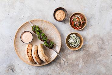 Mausteiset karitsan kebabvartaat, harissamajoneesia, hummusta, feta-kurkkua ja pitaleipää