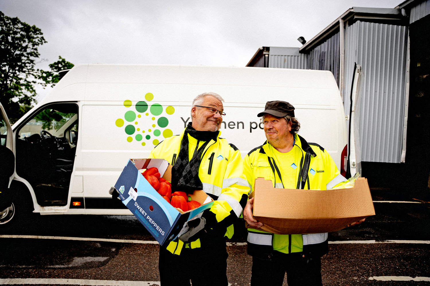 Kespron Hakkilan-keskusvarastolla Yhteisen pöydän auto käy joka arkipäivä noutamassa ruokalahjoituksia.