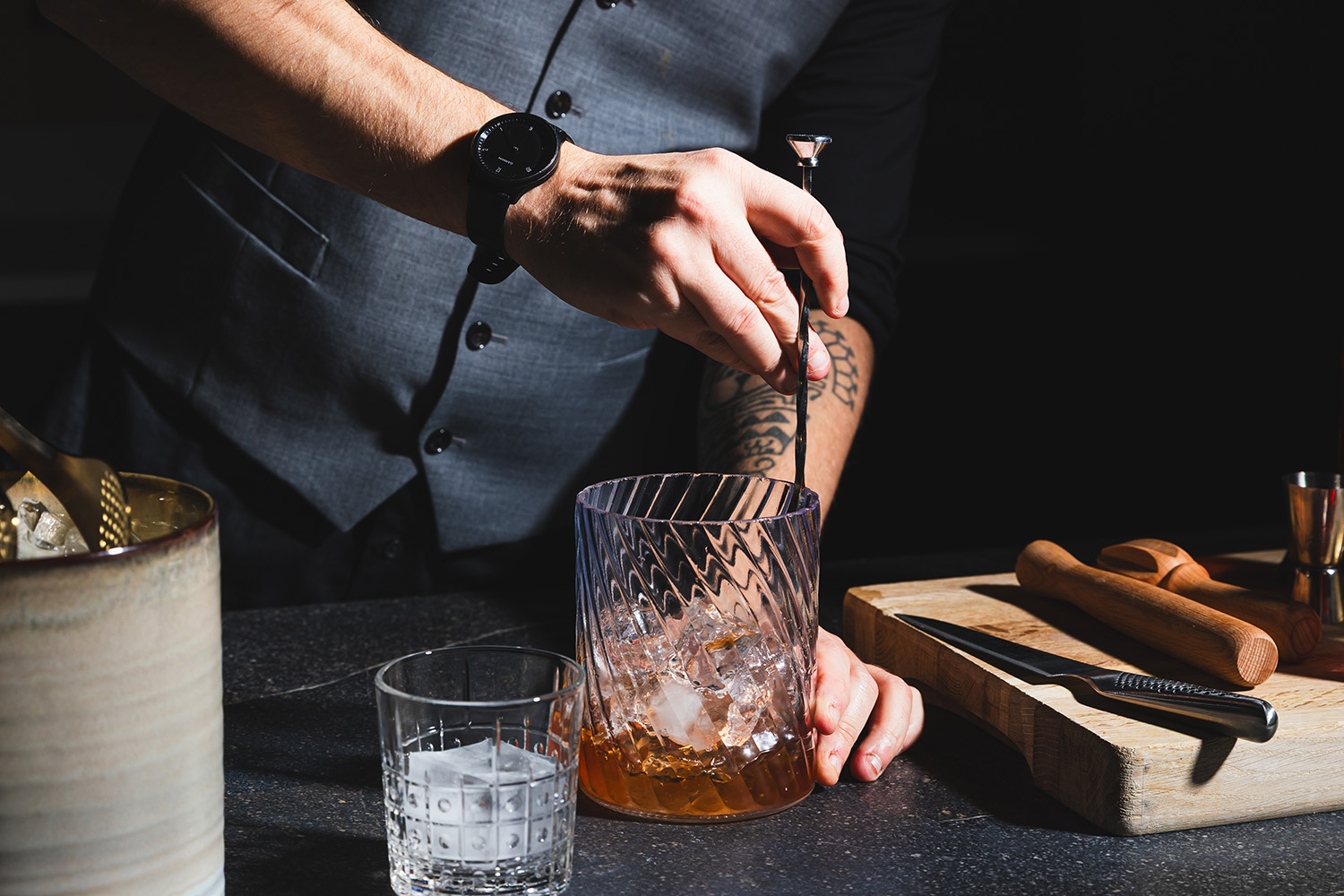 - Sekoita kaikki ainekset jäiden kanssa sekoituslasissa, kunnes ne ovat kylmiä.