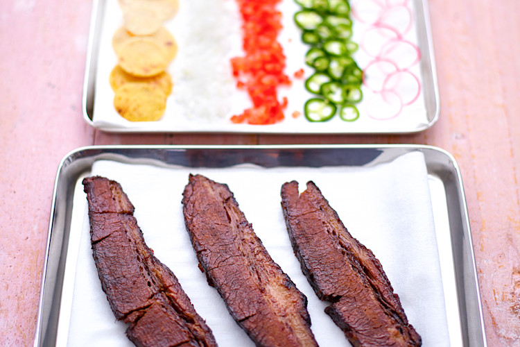 Glaseerattua briskettiä, pico de gallo, mangoa ja rapeat maissitortillat