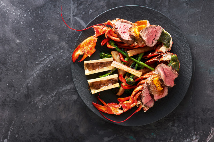 Kokoa isänpäivän kunniaksi komea surf & turf -vati. Juhlaan sopivat parhaat raaka-aineet: Grandchester Black Angus -sisäfilee, härän luuydin ja hummerinpyrstö. Taco-maustetahnasta teet maustevoin, joka tuo ytyä annokseen. Grillattu broccoliini ja savulla sävytetty mustajuuri täydentävät kokonaisuuden.