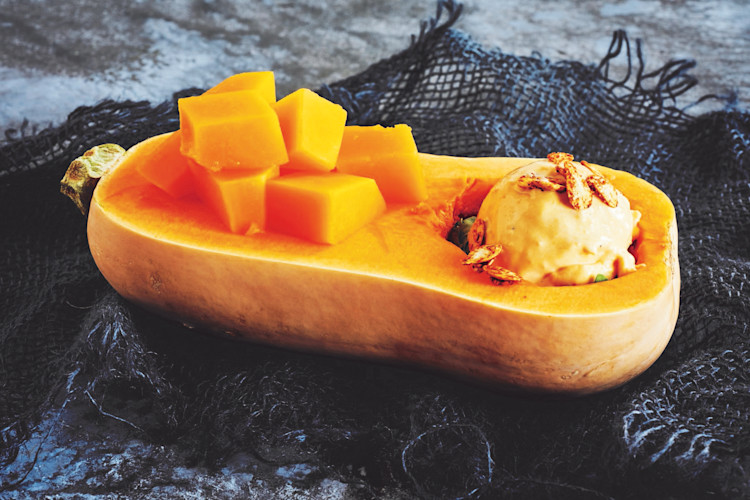 Kurpitsa on monipuolinen raaka-aine, jota voi tarjota läpi menun. Pyöräytä upean värinen hummus Menu Myskikurpitsasta. Kurpitsalyhdyn kaiverrettuasi ota talteen siemenet ja paahda ne taco-mausteen kanssa maistuviksi. Mausta jäätelö soseutetulla myskikurpitsalla, inkiväärillä ja kanelilla.