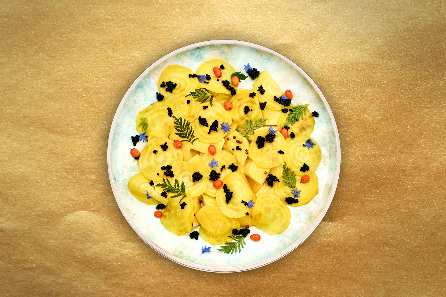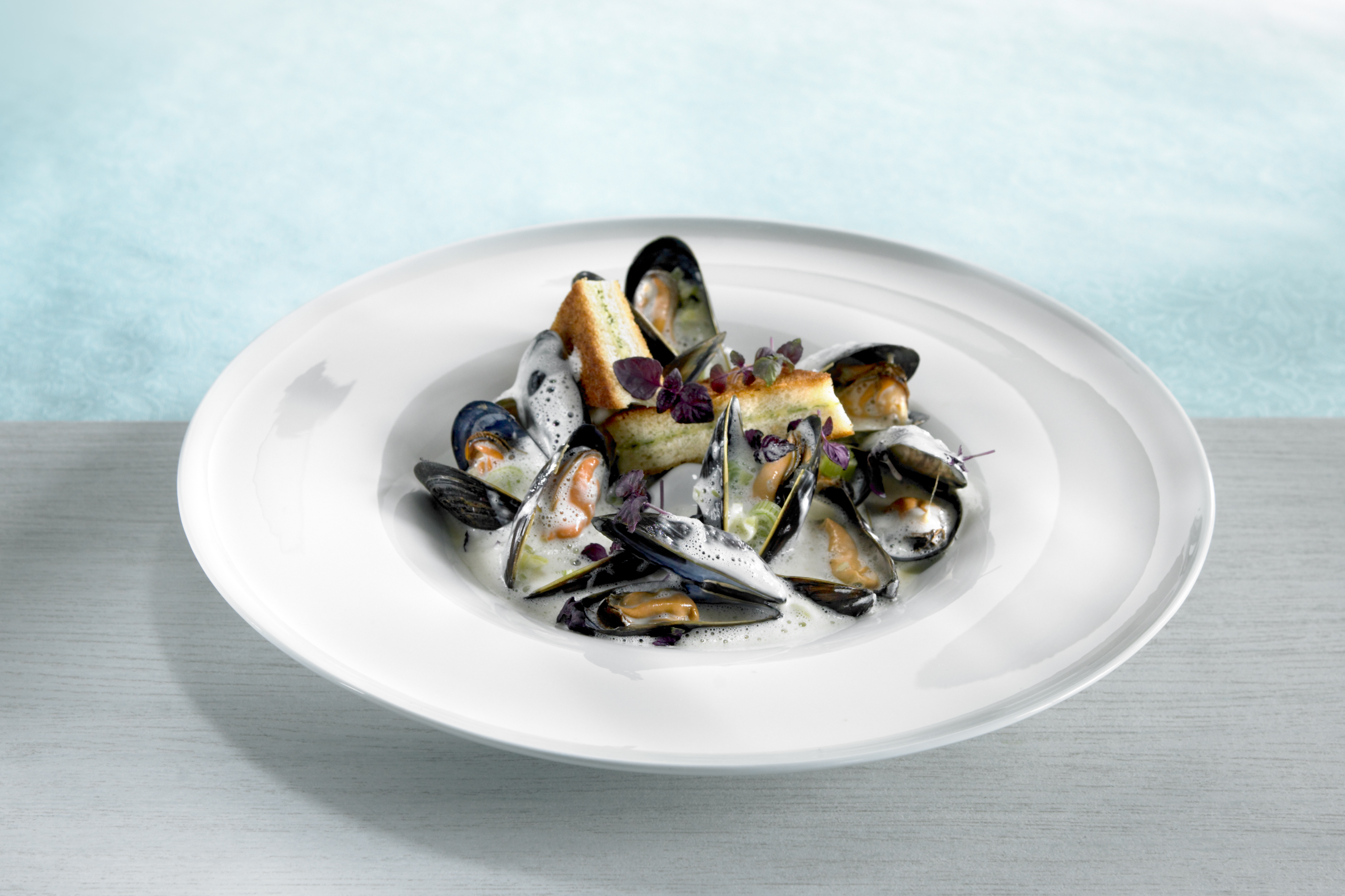 2. Kypsennä sini- ja sydänsimpukat perinteisesti valkoviinissä ja jäähdytä. Valmista simpukoiden keitinliemestä, sahramista ja kermasta liemi. Lisää liivate ja annostele sifonista.