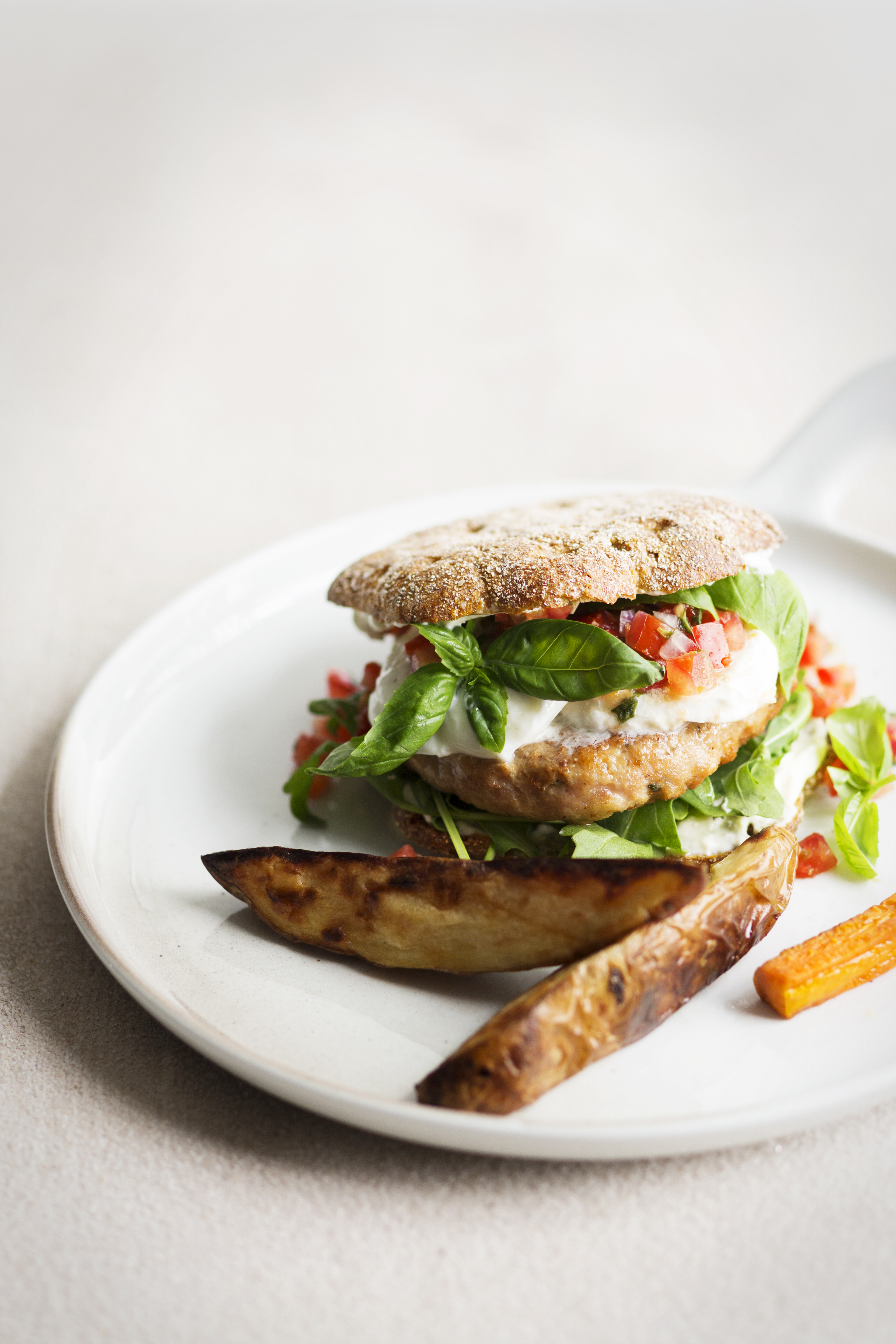 1. Sekoita broilerin jauheliha, korppumuru, juusto, kananmuna, basilika ja mausteet taikinaksi.