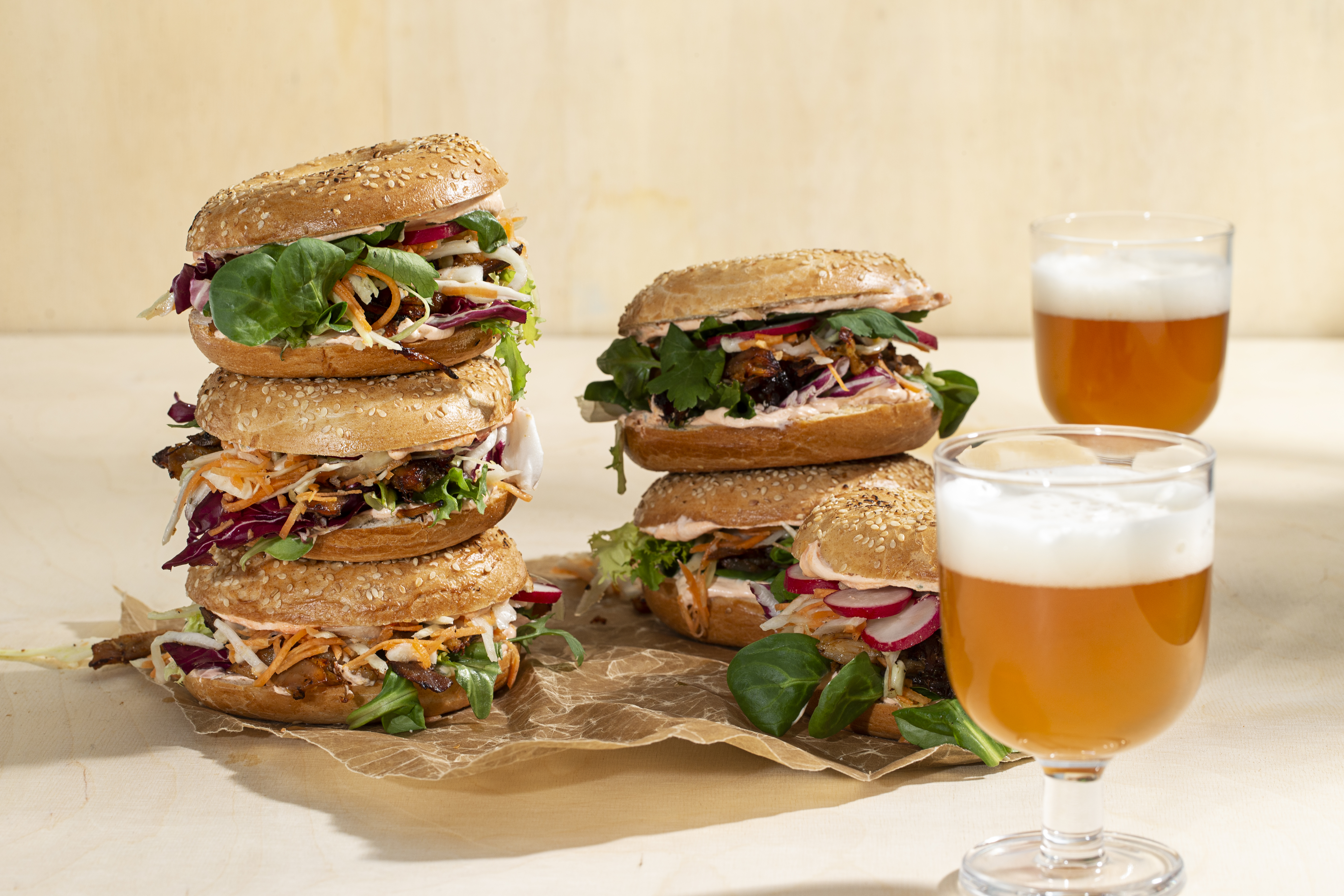 5. Lisää päällimmäiseksi jäähtynyt pikkelöity salaatti ja sriracha-majoneesilla voideltu kansi.