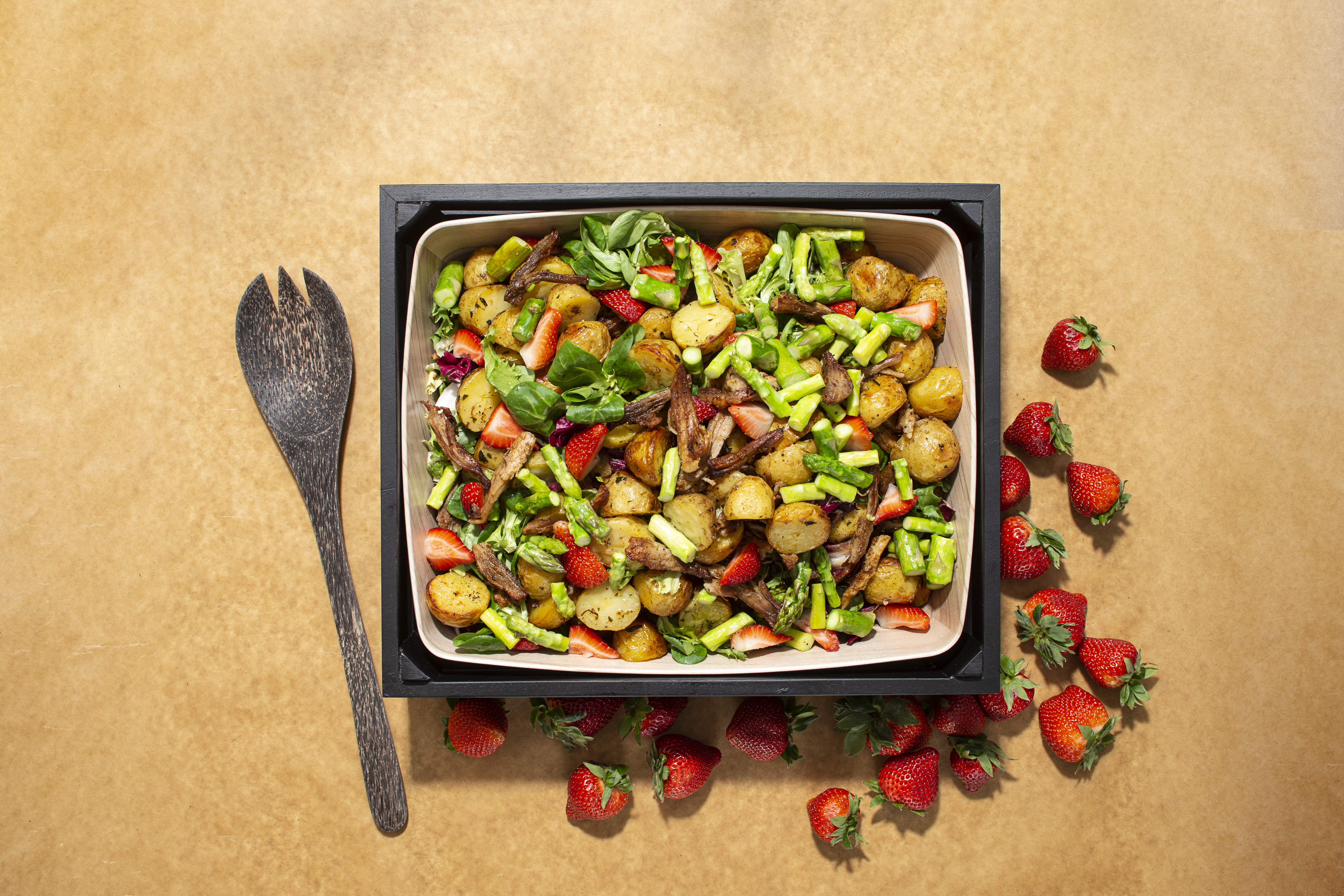 5. Kokoa annokseen Chukc Roll -pihvi, broilerin siipiä ja paahdettuja varhaisperunoita. Viimeistele annos maustevoilla.