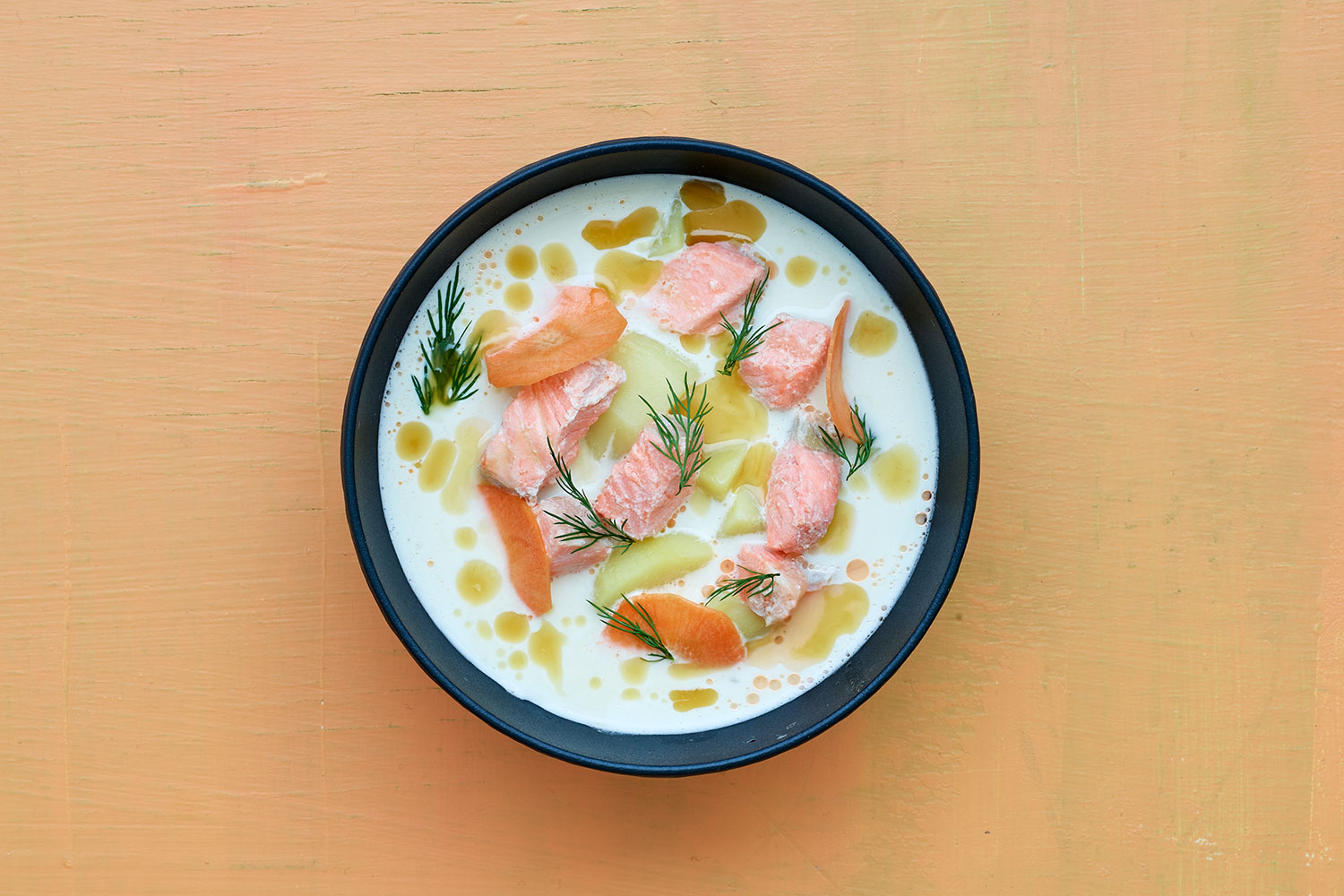 6. Lisää liemeen porkkanakuutiot, perunat ja leikattu kevätsipuli. Anna kiehahtaa ja lisää lohipullat.