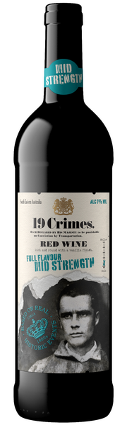 Go with the flow. Follow the crowd. Do what’s expected. OR DON’T. Shiraz -voittoinen "mid strenght" 19 Crimes red blend on viini, josta alkoholi on osittain poistettu. Juomassa on marjaisan täyteläinen maku, jossa punaherukoiden, tummien kirsikoiden ja suklaan makua vaniljalla täydennettynä. 19 Crimes perustuu tositarinaan nyky-Australian historiasta ja maahan 1700-1800 -luvuilla karkotetuista rikollisista kaikkiaan 19 eri rikoksen perusteella. Jokaiseen korkkiin on painettu yksi 19 rikoksesta, ja skannaamalla takaetiketissä olevaa QR-koodia voit kuunnella John O´Reillyn tarinan.