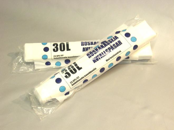 Sangallinen roskakassi 30l, valkoinen - edullinen roskakassi kotikäyttöön tai ammattilaiselle! Pussin siirtelyä ja sulkemista helpottavat kantokahvat! Vahvuus 0,012mm.