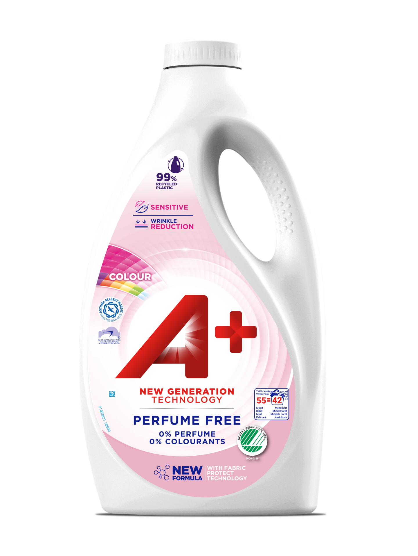 A+ Sensitive Color pyykinpesuneste on kirjopyykille suunnattu ja tehokas matalissakin lämpötiloissa. Hajusteeton. Tuote on Joutsenmerkitty ja sillä on Allergia- ja Astmaliiton tunnus. Pakkaus on tehty 99% kierrätysmuovista, ja sen voi käytön jälkeen kierrättää.