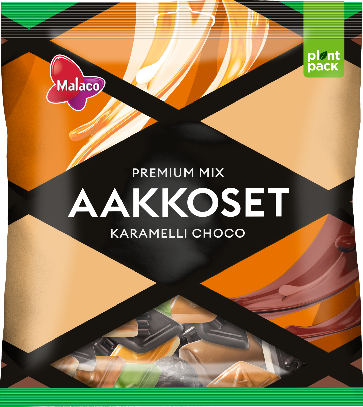Aakkoset Karamelli Choco yhdistää ennen kokemattomalla tavalla suolaista ja makeaa, mikä on varma yhdistelmä aikuiseen makuun. Pussista löytyy kahdeksan makuhermoja kutkuttelevaa karkkia. Sekoituksessa on mm. karamellin makuista viinikumia ja viinikumivaahtoa, suklaapäällystettyä fudgea ja lakritsitoffeepalloja. Karkit on pakattu pussiin, joka on valmistettu 50 % kasvipohjaisesta muovista. Lisätietoja cloetta.com/plantpack Aakkoset - Kirjaimellisesti hyvää.