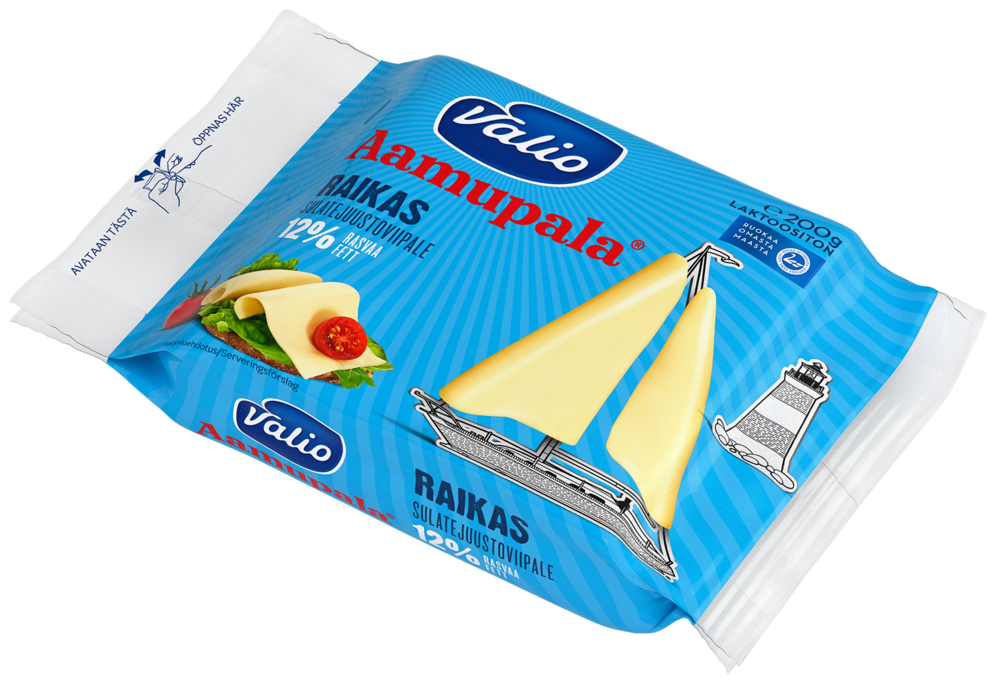 Valio Aamupala® on aurinkoinen ja helppo tapa tehdä voileipä! Nämä suosikkisulatejuustoviipaleet ovat maistuneet aamupalalla ja muillakin leivillä jo vuodesta 1980. Kokeile myös lämpimien voileipien, hampurilaisten ja patongin väliin tai juustokastikkeeseen. Valio Aamupala® Raikas 12 % sulatejuustoviipaleet ovat miellyttävä yhdistelmä keveyttä ja sulatejuuston täyteläisyyttä.