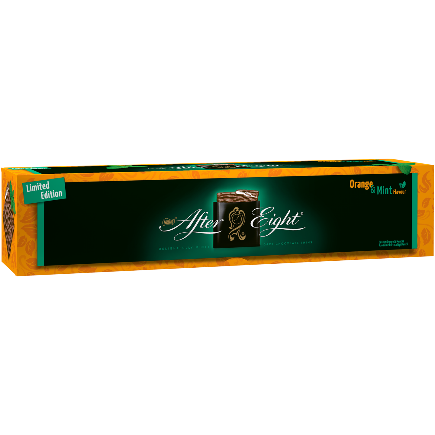 Joulun klassinen minttusuklaamakeinen After Eight Orange twistillä. After Eight on ollut markkinoilla vuodesta 1962 ja sen alkuperäinen resepti on edelleen tuotannossa. Pääosin After Eightin rakastajat nauttivat konvehdit sellaisenaan, mutta sille on olemassa myös kymmeniä herkullisia leivontareseptejä. Tiesitkö muuten, että vuoden After Eight-tuotanto täyttäisi noin 328 jalkapallokenttää?