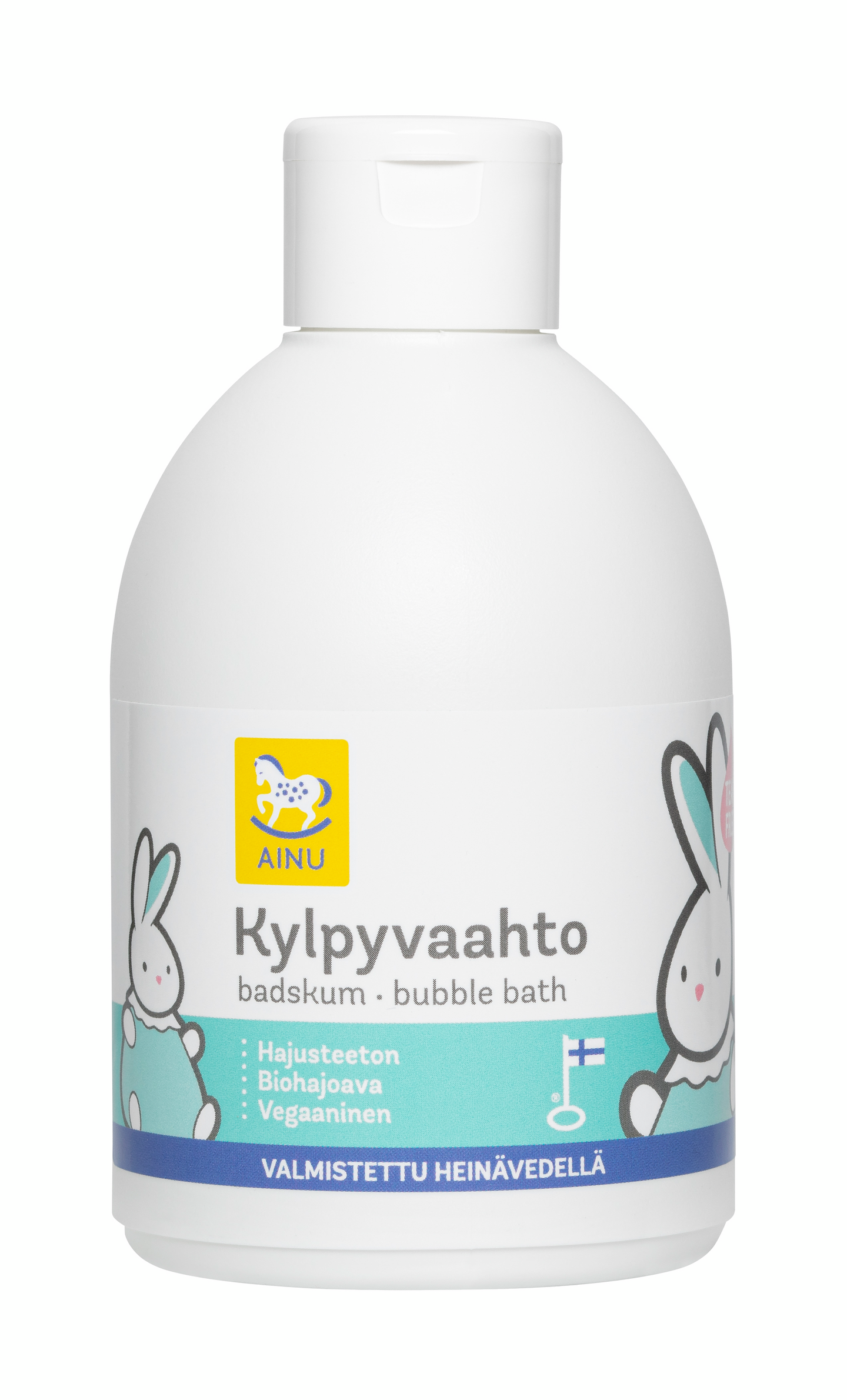 Hajusteeton Ainu Kylpyvaahto on hellävarainen tuote vauvan kylpyhetkiin. Sisältää ihoa kosteuttavia ja rauhoittavia aineosia. Tear free -merkinnän saanut Ainu Kylpyvaahto pesee ilman kyyneleitä. Ainu Kylpyvaahto on biohajoava. Valmistettu Heinävedellä.