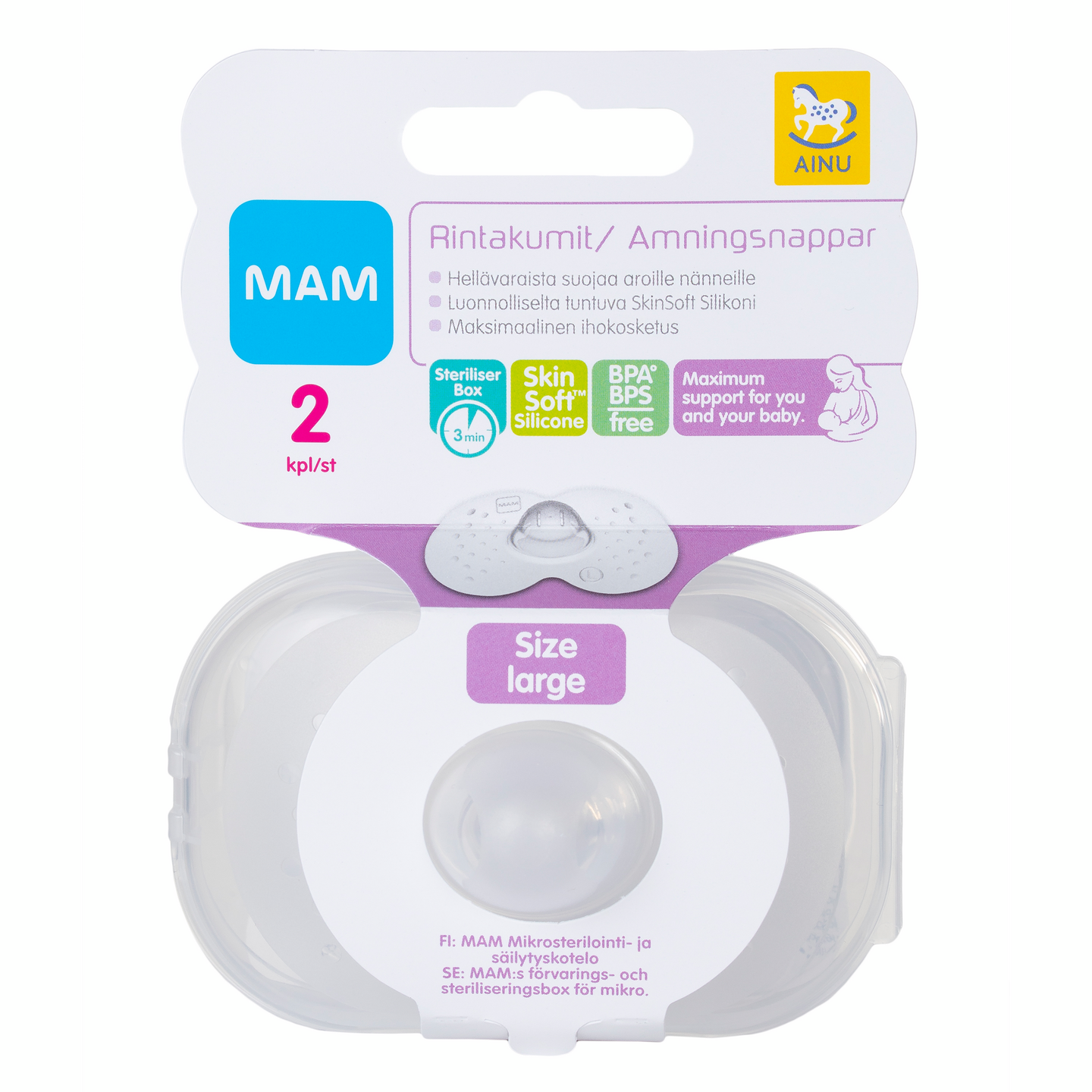 Ainu MAM Rintakumit auttavat, jos rinnanpäät ovat arat tai jos vauvan on vaikea saada otetta nännin muodon vuoksi. Rintakumit on muotoiltu siten, että vauva saa helposti rintaan ihokontaktin ja tuntee maidon tutun tuoksun. Nämä yhdessä edesauttavat maidon herumista sekä vauvan aktiivisuutta rinnalla. Rintakumit on valmistettu erittäin ohuesta silikonista, imuosassa on Ainu MAM tuteista tuttu Skin Soft-pinta. Siivekkeissä on ainutlaatuinen kuvioitu pinta, jonka ansiosta ne ovat hyvin hellävaraiset vauvan kasvojen herkälle iholle.