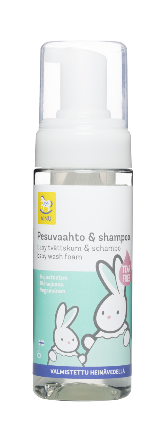 Pumpulin pehmeää vaahtoa - Ainu Pesuvaahto & shampoo sopii koko vartalon pesuun jo vastasyntyneestä, sopii myös hiusten pesuun.