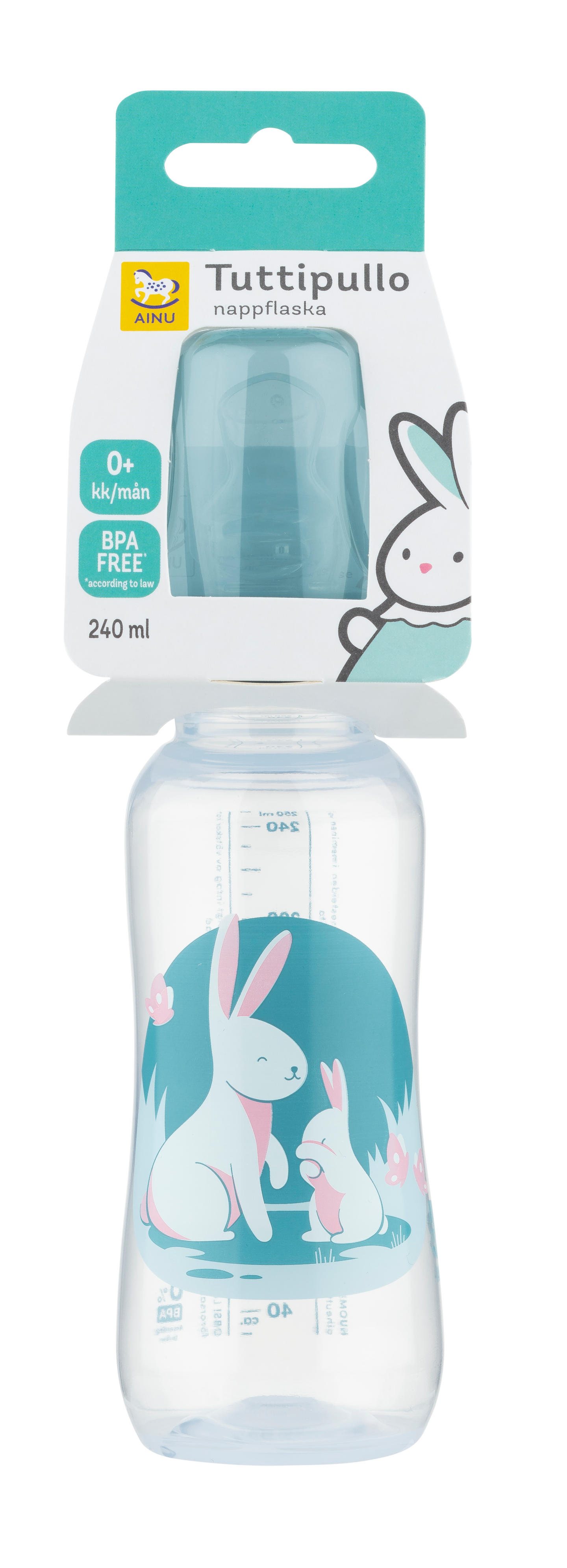 Ainu 240ml TuttipulloAinu Tuttipullo 240ml sopii eri-ikäisille vauvoille myös jo vähän isomman vauvan ruokailuihin, sitä on miellyttävä käyttää ja se on helppo puhdistaa. Tuttipullon mukana on silikoninen vesi/maito pullotutti ja kätevä, vuotamaton lisäkorkki.