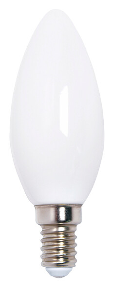 Kynttiläkupuinen opaalilasinen led-lamppu 4,5W. Värilämpötila on kirkas valkoinen 4000K. lampussa on E14-kanta.