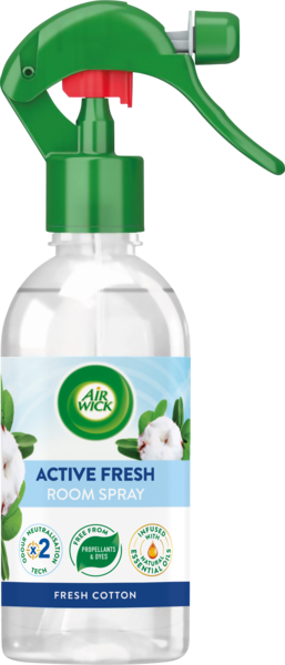 Air Wick Active Fresh -huonesuihke, jossa on x2 hajujen neutralointiteknologia. Sisältää vain tarpeellisen, jotta pääset eroon pahoista hajuista ja saat kotisi raikkaaksi. Ei sisällä ponneaineita eikä väriaineita. Luonnollisia eteerisiä öljyjä sisältävä tuoksu. Pullo on valmistettu 100-prosenttisesti kierrätetystä muovista. Suihkutinkorkki on valmistettu 35-prosenttisesti kierrätetystä muovista.