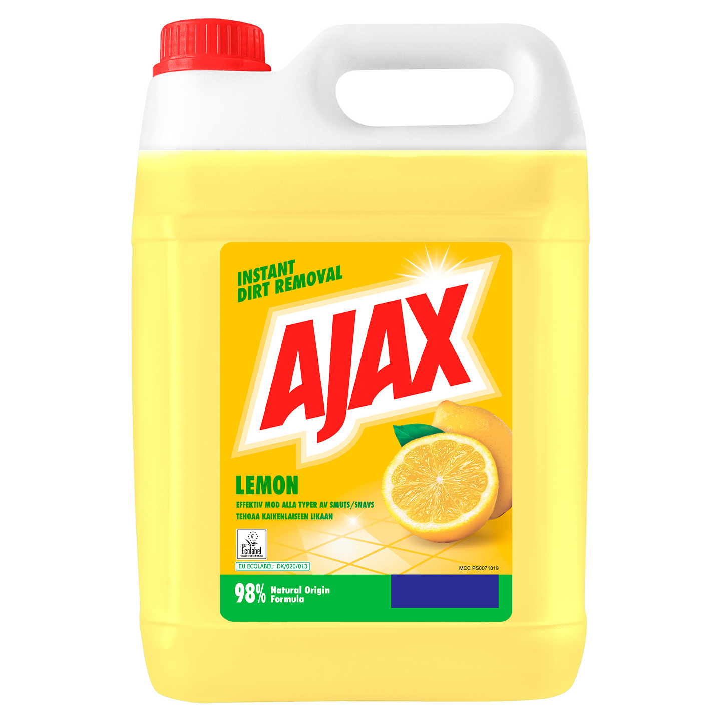 Ajax Lemon on tehokas yleispuhdistusaine, jonka koostumus on valmistettu 98% luonnollista alkuperää olevista ainesosista ja 100% vegaaninen. Se jättää pinnat kiiltävän puhtaiksi ja pirteän sitruunan tuoksuisiksi. Kierräettävä kanisteri ja korkki.