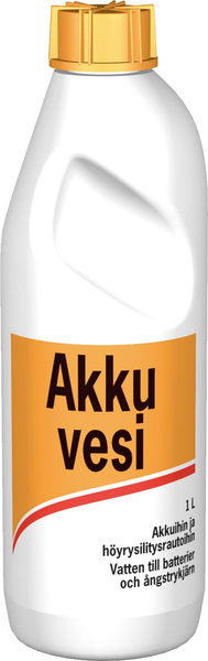 Ionipuhdistettua vettä. Soveltuu käytettäväksi akkuihin, höyrysilitysrautoihin ja muihin puhdistettua vettä vaativiin laitteisiin.