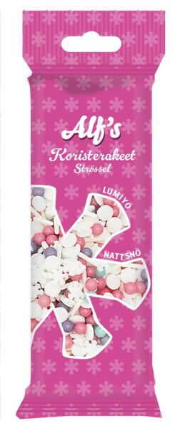 Alf’s Lumiyö koristeraesekoitus sisältää valkoisia lumitähden muotoisia koristekuvioita ja muita vaaleanpunaisia, violetteja, sinisiä ja valkoisia koristerakeita eri muodoissa. Ihastuttavat Alf’s koristerakeet eivät ole vain täydellisiä piparkakkujen koristeluun, vaan ne sopivat loistavasti myös leivonnaisten, kakkujen, jälkiruokien ja jäätelöannosten koristeluun! Koristerakeet ovat erinomainen tapa lisätä juhlapöytään väriä ja säihkettä.