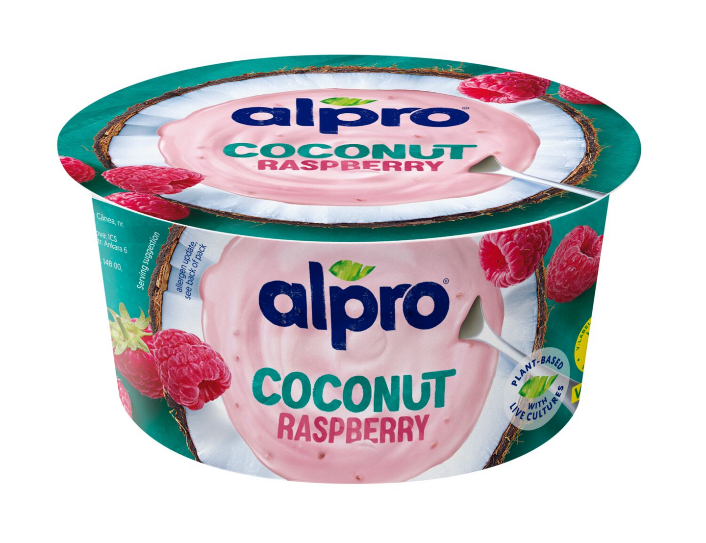 kevyt kookosmaito (81,7%) (vesi, kookoskerma (16,6%), kookosvesi (9,3%)), vadelma (7,3%), sokeri, muunnetut tärkkelykset, luontaiset aromit, happamuudensäätöaineet (sitruunahappo, natriumsitraatit), stabilointiaine (pektiinit), mustaporkkanatiiviste, merisuola, hapatteet (S. thermophilus, L. bulgaricus). Saattaa sisältää pieniä määriä soijaa ja pähkinöitä (ei maapähkinöitä).