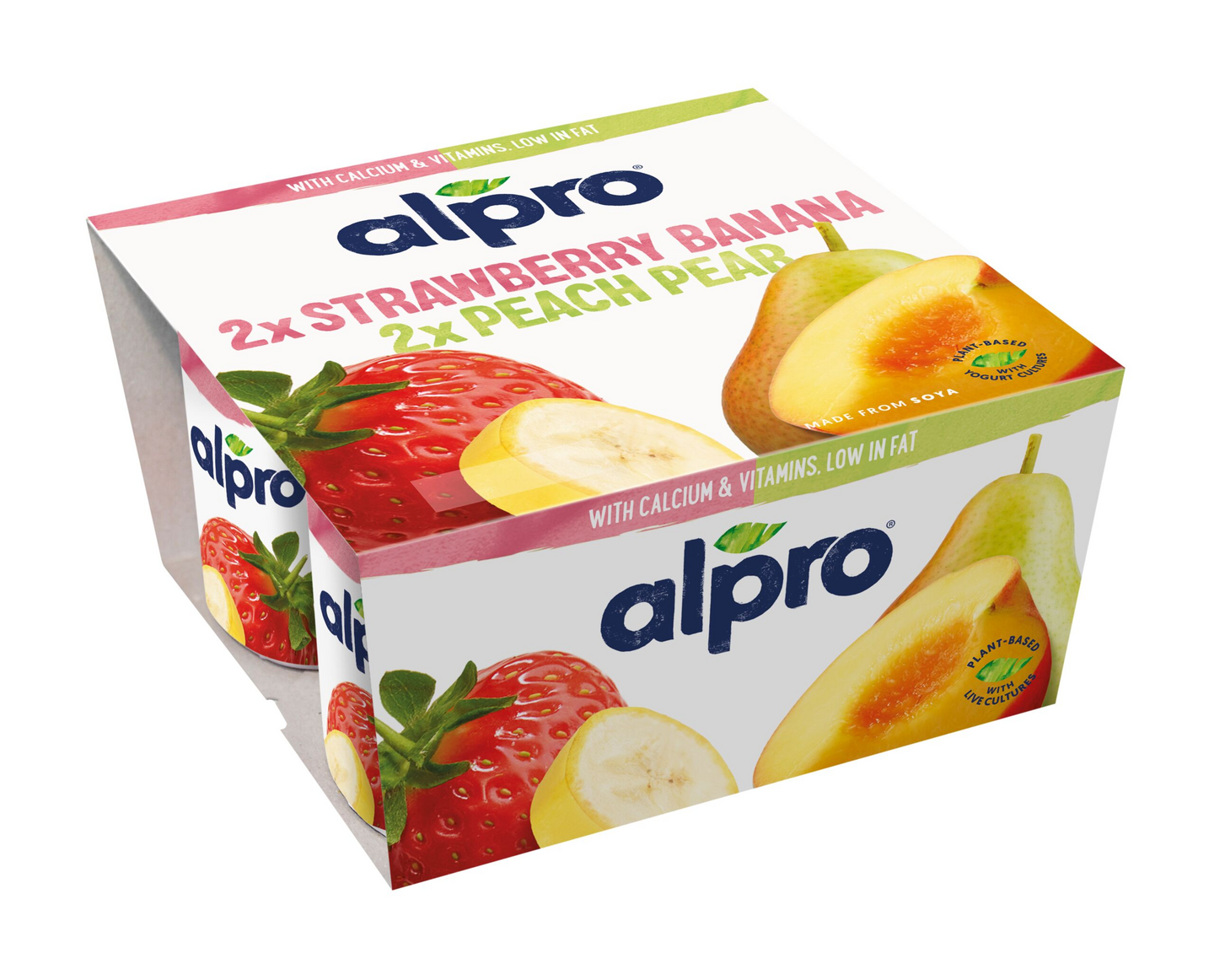 VegaaninenAlpro mansikka-banaani, persikka-päärynä-soijavalmiste. Maukas makupari makeista mansikoista ja banaanista tai mehukkaista persikoista ja päärynöistä. Mukana hedelmäisiä herkkupaloja. Luontaisesti vähärasvainen. Lisätty kalsiumia ja vitamiineja.