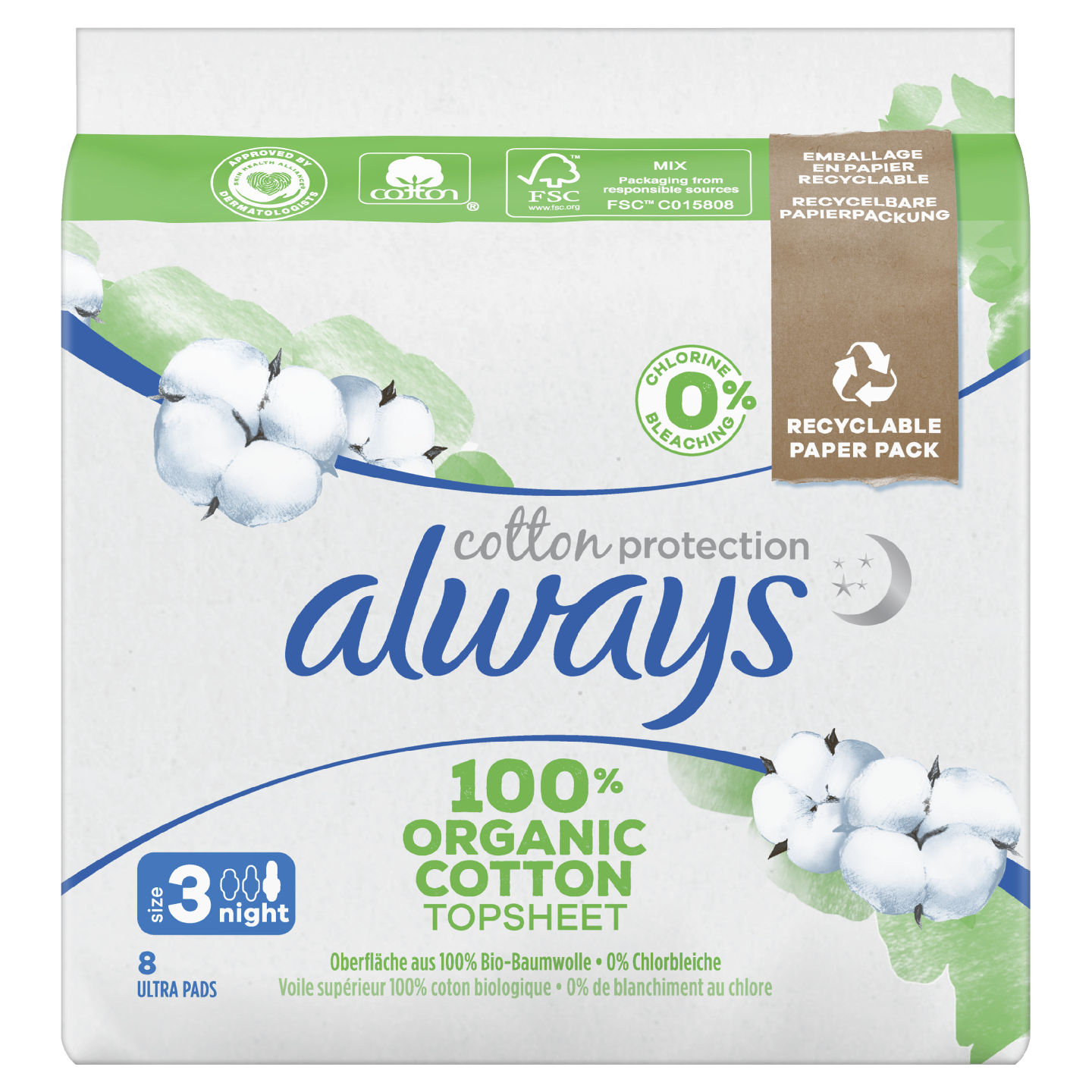 Always Cotton Protection Ultra -siteet huolehtivat niin sinusta kuin ympäristöstä 100 % luomupuuvillaisella pintakerroksella ja kierrätettävällä paperipakkauksella. Ohuen, erittäin mukavan tuntuisen siteen ytimessä olevan nestettä lukitsevan geelin ansiosta tunnet olosi suojatuksi ja siivekkeet pitävät siteen paikoillaan. Always Cotton Protection Night -siteet ovat ihanteelliset kohtalaiseen vuotoon L-koon pikkuhousuissa tai runsaaseen vuotoon M- tai L-koon pikkuhousuissa. Siteet eivät sisällä hajusteita tai väriaineita, eikä niitä ole kloorivalkaistu. Ne ovat Skin Health Alliance -liiton dermatologien hyväksymät ja Cotton Inc.:n sertifioimat.