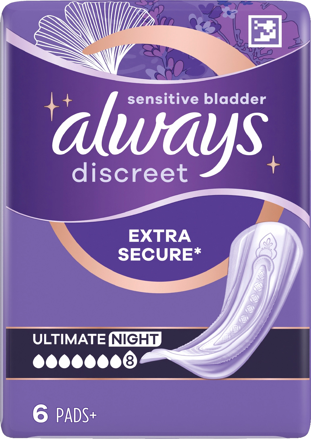 Valikoimamme imukykyisin side, jonka ansiosta voit nukkua huolettomasti. Always Discreet Ultimate Night -inkontinenssisuojat ovat erittäin varmoja. Side on suunniteltu erittäin suojaavaksi ja vielä imukykyisemmäksi, jotta sinun ei tarvitse huolehtia vuodoista. Niiden rakenne mahdollistaa tehokkaan suojan ja erittäin ohuen ytimen, joten sinun ei tarvitse tinkiä mukavuudesta ja suojauksesta. Jos aivastaminen tai nauraminen aiheuttaa virtsankarkailua, Always Discreet Ultimate Night -inkontinenssisuojat ovat suojaava ratkaisu.