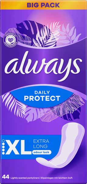 Always Dailies Long Plus Extra Protect -pikkuhousunsuojat miedolla tuoksulla suojaavat ja pitävät olon raikkaana koko päivän. Tavallista pidemmät Long Plus Extra Protect -pikkuhousunsuojat tarjoavat lisäsuojaa ja luotettavaa raikkautta. Tuoksuja neutralisoivan tekniikan ja imukykyisen alueen sisältävät pikkuhousunsuojat suojaksi valkovuotoon, epäsäännöllisiin kuukautisiin tai niukkaan vuotoon.