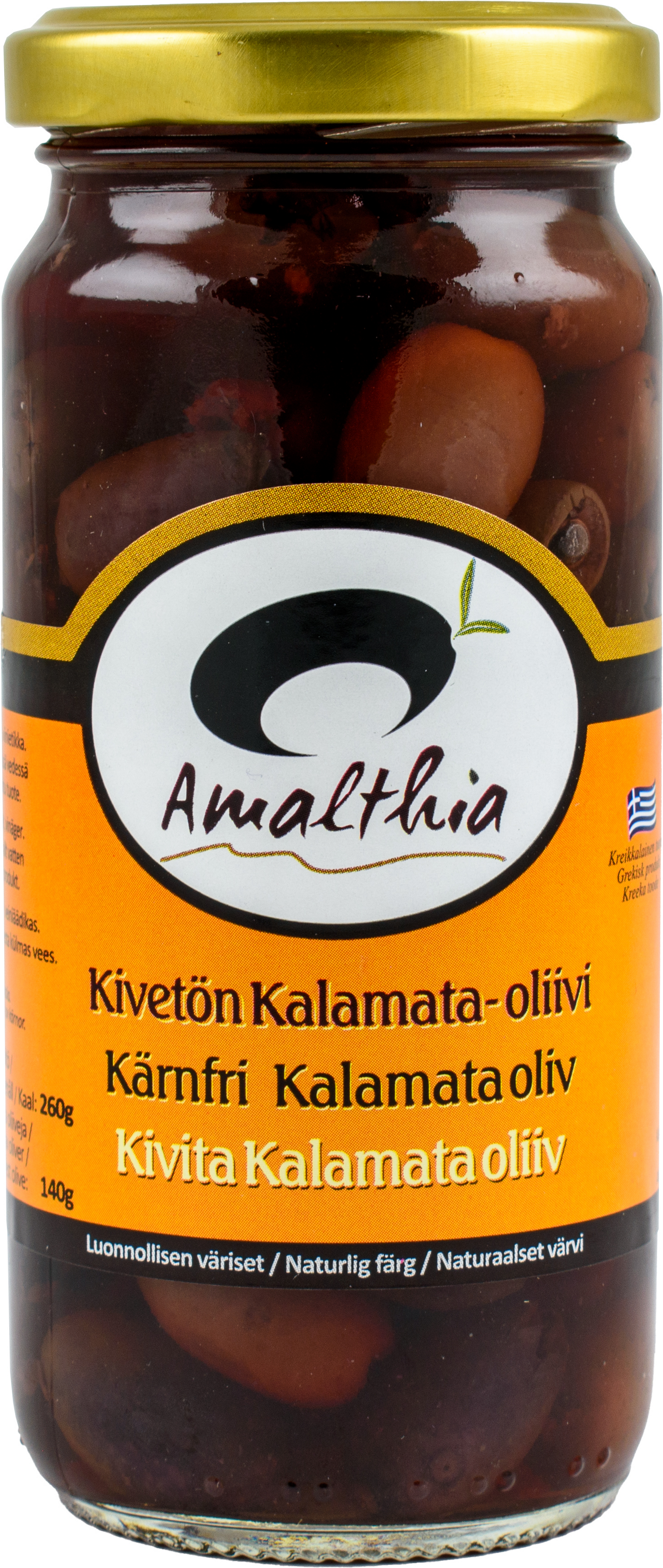 Amalthian kivettömät Kalamata-oliivit ovat maukkaita kreikkalaisia luonnostaan tummia oliiveja. Oliivit saavat tumman värinsä siitä, kun ne saavat olla puussa kypsymiseen asti. Kalamata-oliivi on koostumukseltaan pehmeä. Oliiveja voi käyttää mm. salaateissa, pizzan päällä ja pataruoissa. Marinoi tuoreilla yrteillä ja kreikkalaisella oliiviöljyllä ja nauti hyvässä seurassa meze-pöydän ääressä.