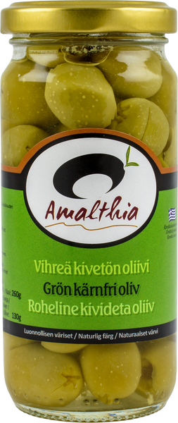 Amalthian vihreät kivettömät oliivit ovat maukkaita kreikkalaisia oliiveja. Marinoi yrteillä makusi mukaan. Käytä salaateissa ja nauti cocktail-palana!