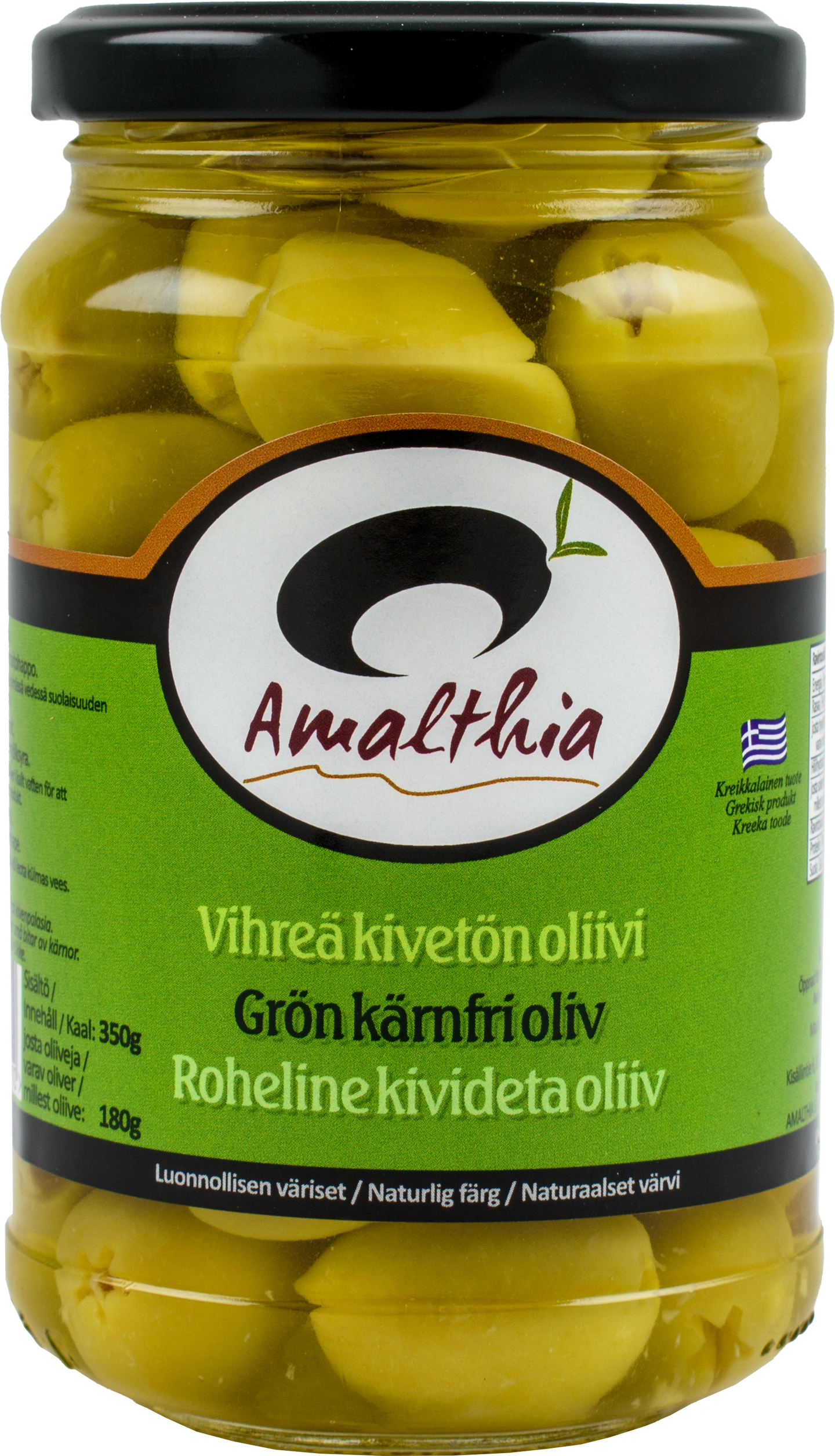 Amalthian vihreät kivettömät oliivit ovat maukkaita kreikkalaisia oliiveja. Marinoi yrteillä makusi mukaan. Käytä salaateissa ja nauti cocktail-palana!