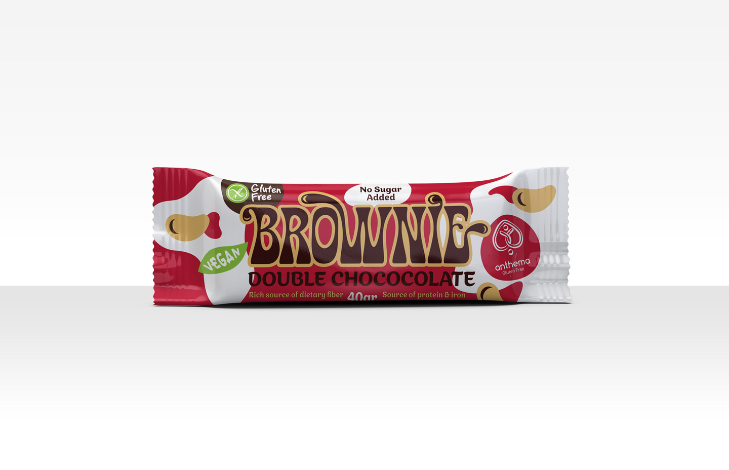 VegaaninenAnthema Double Chocolate Brownie -patukka on gluteeniton ja vegaaninen, eikä sisällä lisättyä sokeria. Mehevä sisus ja täydellinen koostumus tekevät siitä ainutlaatuisen. Hasselpähkinöiden, saksanpähkinöiden, vaniljan ja suklaan täydellinen yhdistelmä luo herkullisen makeuden, joka uudistaa klassisen brownien elämyksen.