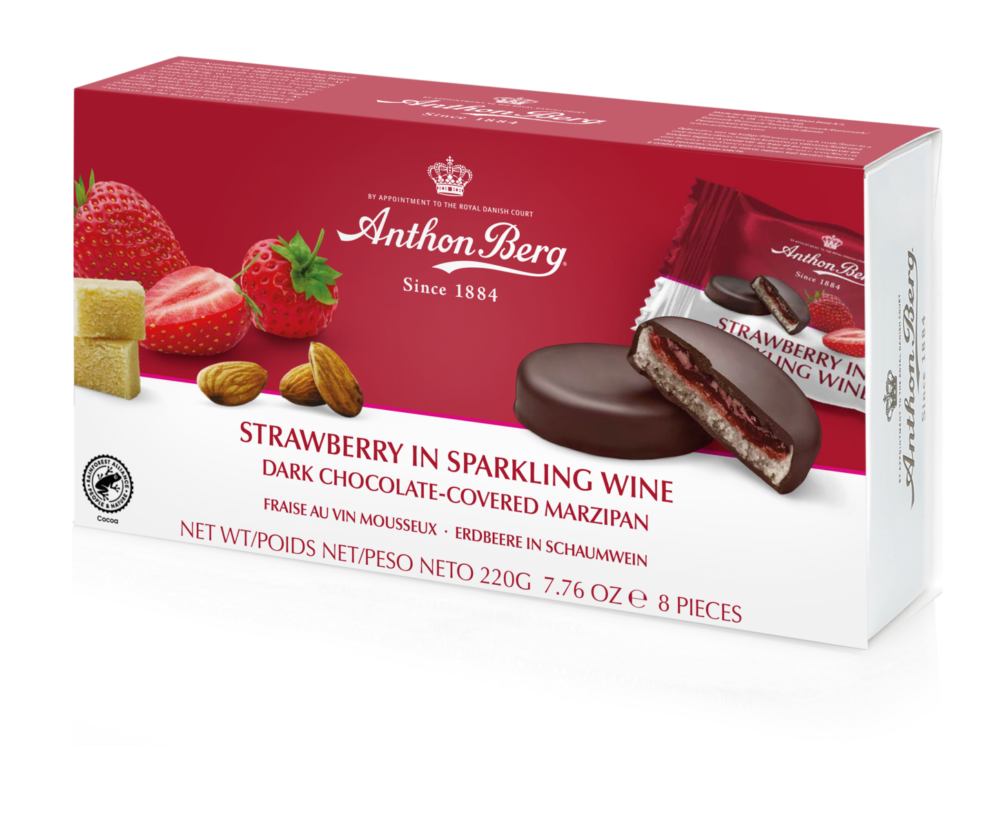 Sokeri, MANTELI 21%, kaakaomassa*, mansikka 9%, tärkkelyssiirappi, vesi, kaakaovoi*, viinit (kuohuviini 1,3%, valkoviini), alkoholi, MAITORASVA, aromi, emulgointiaine (lesitiini), happo (sitruunahappo), sakeuttamisaine (pektiini), säilöntäaineet (sorbiinihappo, kaliumsorbaatti), happamuudensäätöaine (trinatriumsitraatti). Tuote saattaa sisältää jäämiä HASSELPÄHKINÄSTÄ. ALKOHOLI 1,6 PAINO-%. Tumma suklaa sisältää vähintään 50% kaakaokuiva-ainetta. *Rainforest Alliance -sertifioitu. www.ra.org