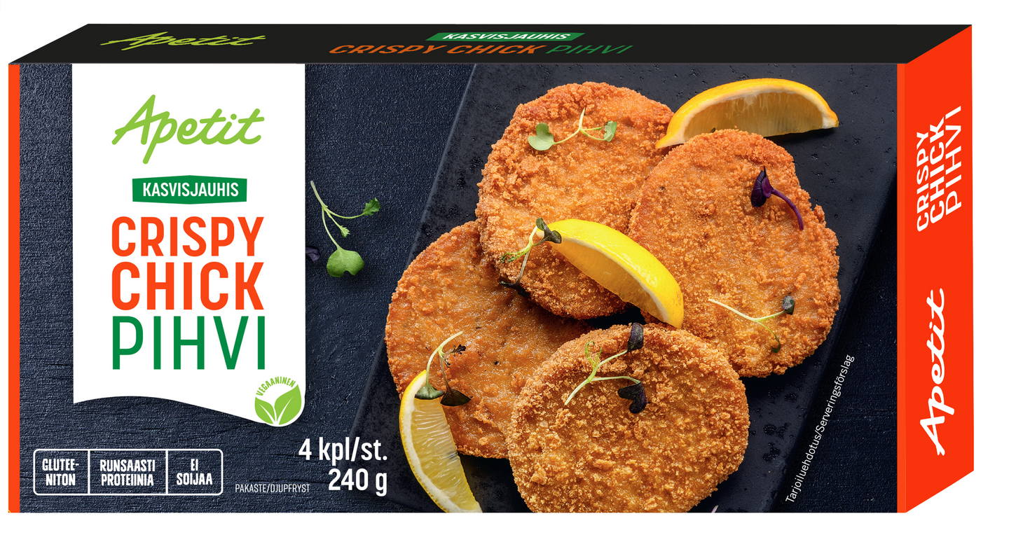 VegaaninenApetit Kasvisjauhis Crispy Chick pihvi on herkullinen paneroitu herneproteiinipihvi, joka sopii esim. perunamuusin, salaatin tai ranskanperunoiden kanssa sekä burgerin väliin ja grillattavaksi. Tuote on gluteeniton ja soijaton ja soveltuu vegaaniseen ruokavalioon. Apetit Kasvisjauhis -tuotteet ovat täysin kasviperäisiä ja maistuvat koko perheelle. Niiden avulla onkin helppo lisätä kasvisruokaa arkeen.