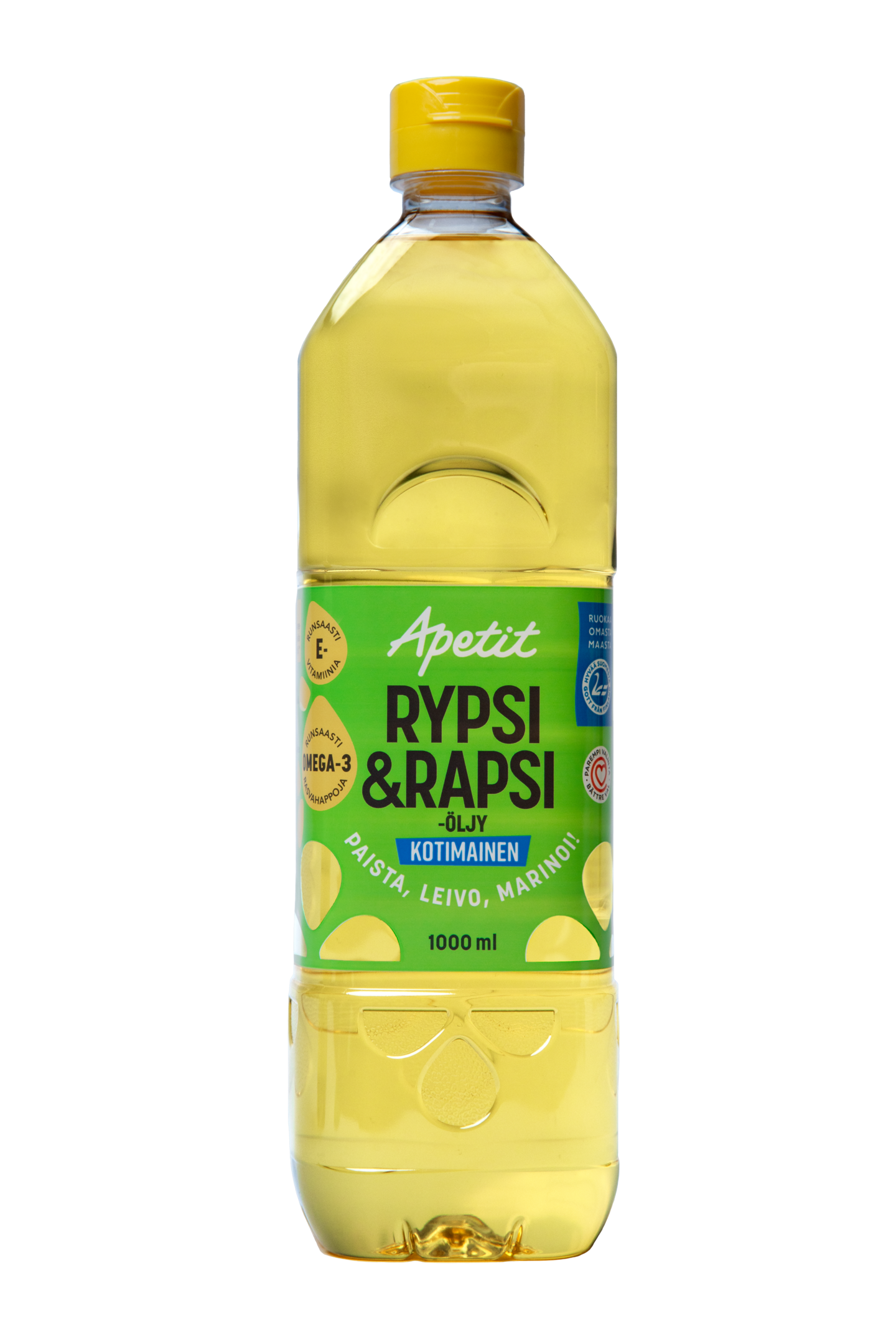 100 % suomalainen Apetit rypsi-rapsiöljy puristetaan ja pullotetaan Kirkkonummella suomalaisilla pelloilla kasvaneista rypsin ja rapsin siemenistä. Monipuolinen ja mieto öljy soveltuu paistamiseen, leivontaan, kastikkeisiin, marinointiin ja friteeraukseen. Sisältää luonnostaan runsaasti omega-3 rasvahappoja ja E-vitamiinia.