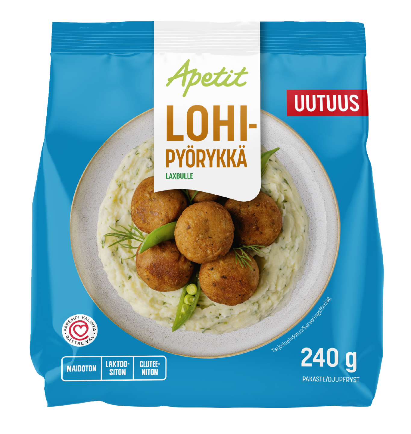 Apetit Lohipyörykät ovat helppo tapa tuoda terveellistä kalaa arkiaterialle, ja ne maistuvat koko perheelle. Herkulliset pyörykät sisältävät lohta ja seitiä, ja ne on maustettu ruohosipulilla, tillillä ja sitruunalla. Kuumenna pyörykät jäisinä tai osittain sulaneina paistinpannussa, uunissa tai airfryerissa. Pyörykät ovat laktoosittomia, maidottomia ja gluteenittomia, ja niiden suolapitoisuus on vain 0,9%. Apetit Lohipyöryköille on myönnetty Sydänmerkki, ja ne valmistetaan tehtaassamme Säkylässä.