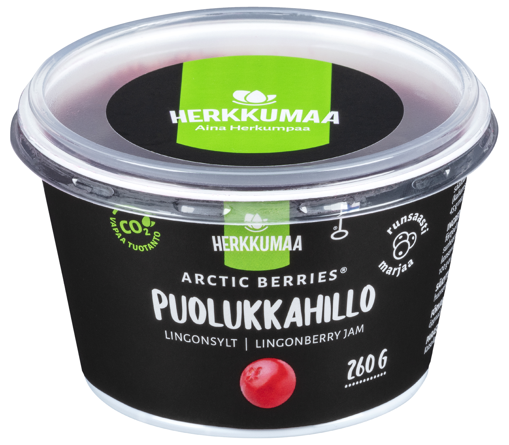 Herkkumaa Arctic Berries® puolukka on hillo, jossa maistuu tasapuolisesti sekä makeus että kirpeys. Puolukka on pohjoisen luonnon oma supermarja, joka sopii happamuutensa ansiosta niin suolaisten kuin makeiden ruokien kanssa nautittavaksi. Puolukkahillo on saatavana uudessa 260 g:n pikaripakkauksessa.