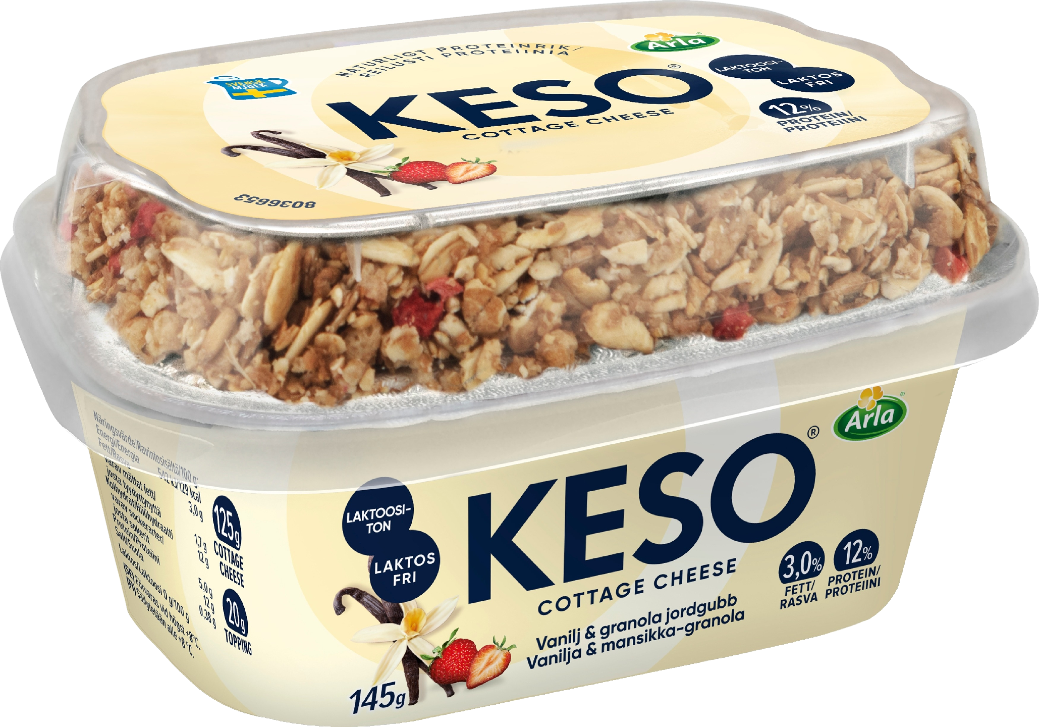LaktoositonArla KESO raejuustovälipala vanilja & mansikka-granola on herkullinen, proteiinirikas yhdistelmä pehmeää KESO-vaniljaraejuustoa ja rapeaa mansikka-granolaa. Kokeile välipalahetkiin sellaisenaan tai nauti yhdessä marjojen kanssa. Tuote on laktoositon.