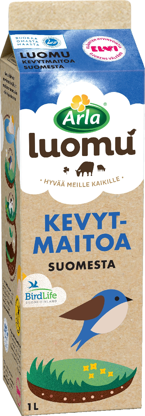 Arla Luomu kevytmaitoa Suomesta on valmistettu Suomessa suomalaisesta luomumaidosta. Luomu kevytmaito pastöroidaan, mutta sitä ei homogenoida. Luomumaitoa onkin hyvä ravistaa hiukan ennen sen käyttöä. Luomukevytmaidossa on rasvaa 1,5 %. Luomumaito sopii niin juotavaksi kuin leivontaan ja ruoanlaittoonkin. Sisältää runsaasti kalsiumia. Arla Luomu kevytmaito pakataan valkaisemattomaan nestekartonkipakkaukseen. Ruskea pakkaus on merkittävästi ekologisempi valinta ja 100% puupohjainen! Arla Luomu maidoilla on Vapaat & laiduntavat lehmät merkki. Tällä merkillä varustettujen tuotteiden maito tulee suomalaisilta tiloilta, joissa lehmät elävät vapaana pihatoissa, laiduntavat kesäisin ja pääsevät sään ja omien mieltymysten mukaan ulkoilemaan myös talvisin. Tuotteella on myös ELVI-merkki joka on Suomen ensimmäinen riippumaton eläinten hyvinvointimerkki.