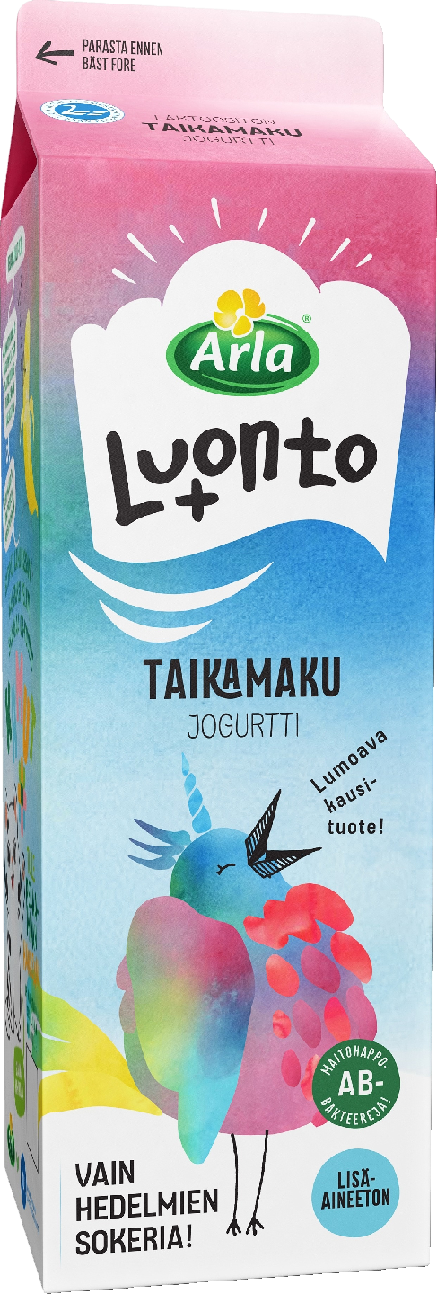 LaktoositonArla Luonto + jogurttien uusi tulokas on Taikamaku, joka sisältää makeaa kirsikkaa ja pehmeää banaania. 100% kierrätettävästä kartonkipakkauksesta voi jakaa ja maistella yhdessä koko perhe. Makeus tulee vain hedelmästä, jolloin makuprofiili on aina miedon herkullinen ja ei niin makea. Ne ovat siis luonnollisen hyviä. Kaikki Arla Luonto+ jogurtit ovat lisäaineettomia, laktoosittomia ja sisältävät luustolle tärkeää kalsiumia ja D-vitamiinia. Ne valmistetaan suomalaisesta maidosta Sipoossa.