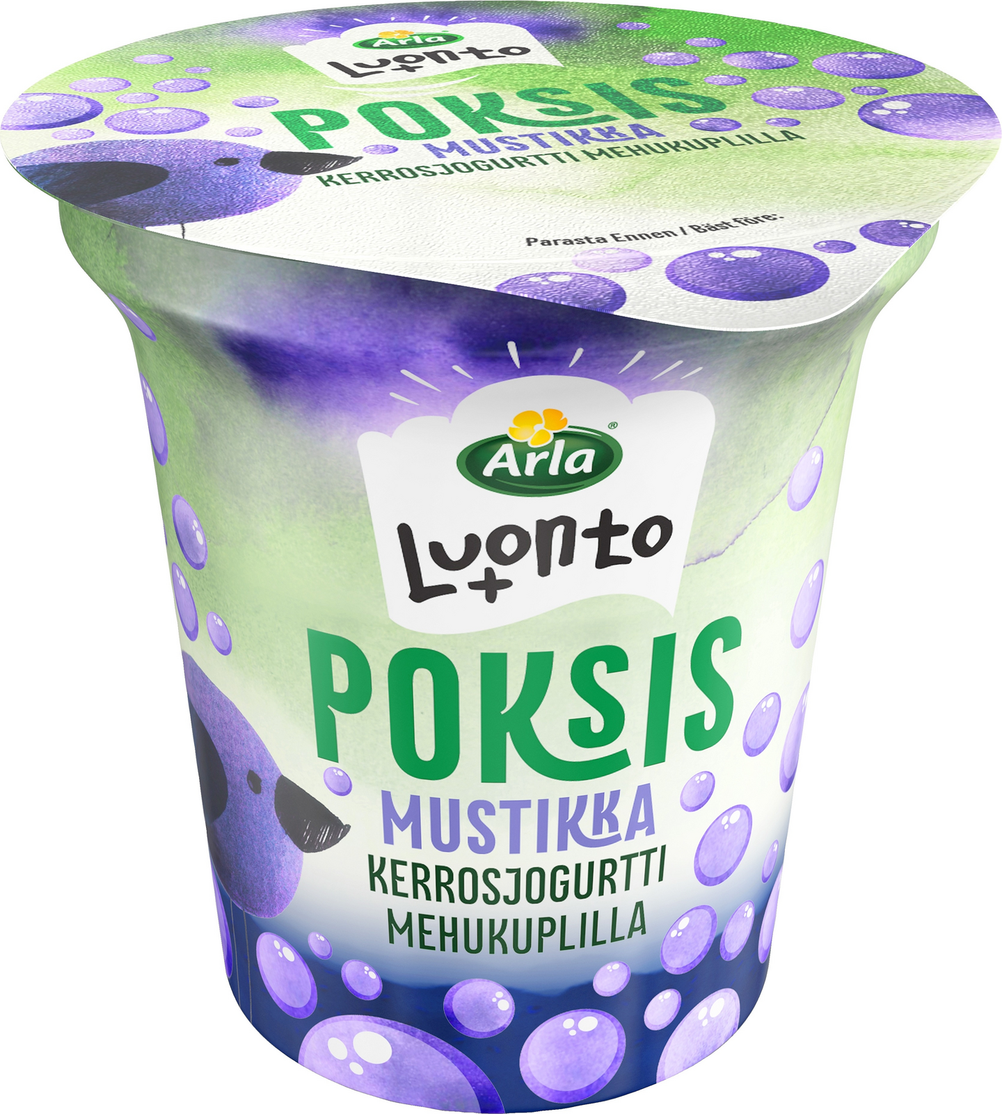 POKS! Poksahteleva mustikkakerrosjogurtti mehukuplilla - Arla Luonto+ Poksis on veikeä kerrosjogurtti, jossa hedelmähillon joukkoon on sekoitettu suussa poksahtelevia mehukuplia. Samettisen sileän luonnonjogurtin ja mehukuplia sisältävän hillon yllättävä yhdistelmä saa hymyn huulille. Lempeän luonnollisina makuina ovat makea mansikka, mehevä mustikka ja pirteä persikka. Verrattoman hauska makukokemus koko perheelle! Kuten kaikissa Arla Luonto+ jogurteissa myös Poksiksessa makeus on vain hedelmän sokerista, niissä on vähemmän makeutta, mutta paljon iloa ja hauskuutta!