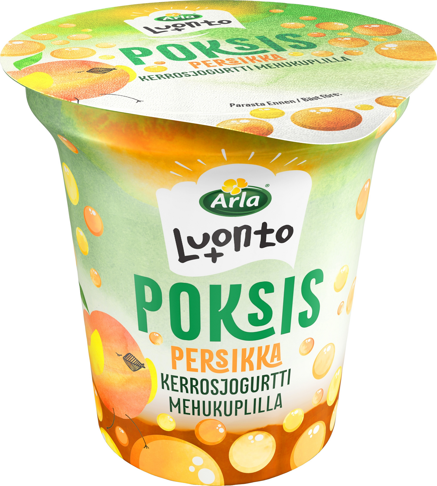 POKS! Poksahteleva persikkakerrosjogurtti mehukuplilla - Arla Luonto+ Poksis on veikeä kerrosjogurtti, jossa hedelmähillon joukkoon on sekoitettu suussa poksahtelevia mehukuplia. Samettisen sileän luonnonjogurtin ja mehukuplia sisältävän hillon yllättävä yhdistelmä saa hymyn huulille. Lempeän luonnollisina makuina ovat makea mansikka, mehevä mustikka ja pirteä persikka. Verrattoman hauska makukokemus koko perheelle! Kuten kaikissa Arla Luonto+ jogurteissa myös Poksiksessa makeus on vain hedelmän sokerista, niissä on vähemmän makeutta, mutta paljon iloa ja hauskuutta!
