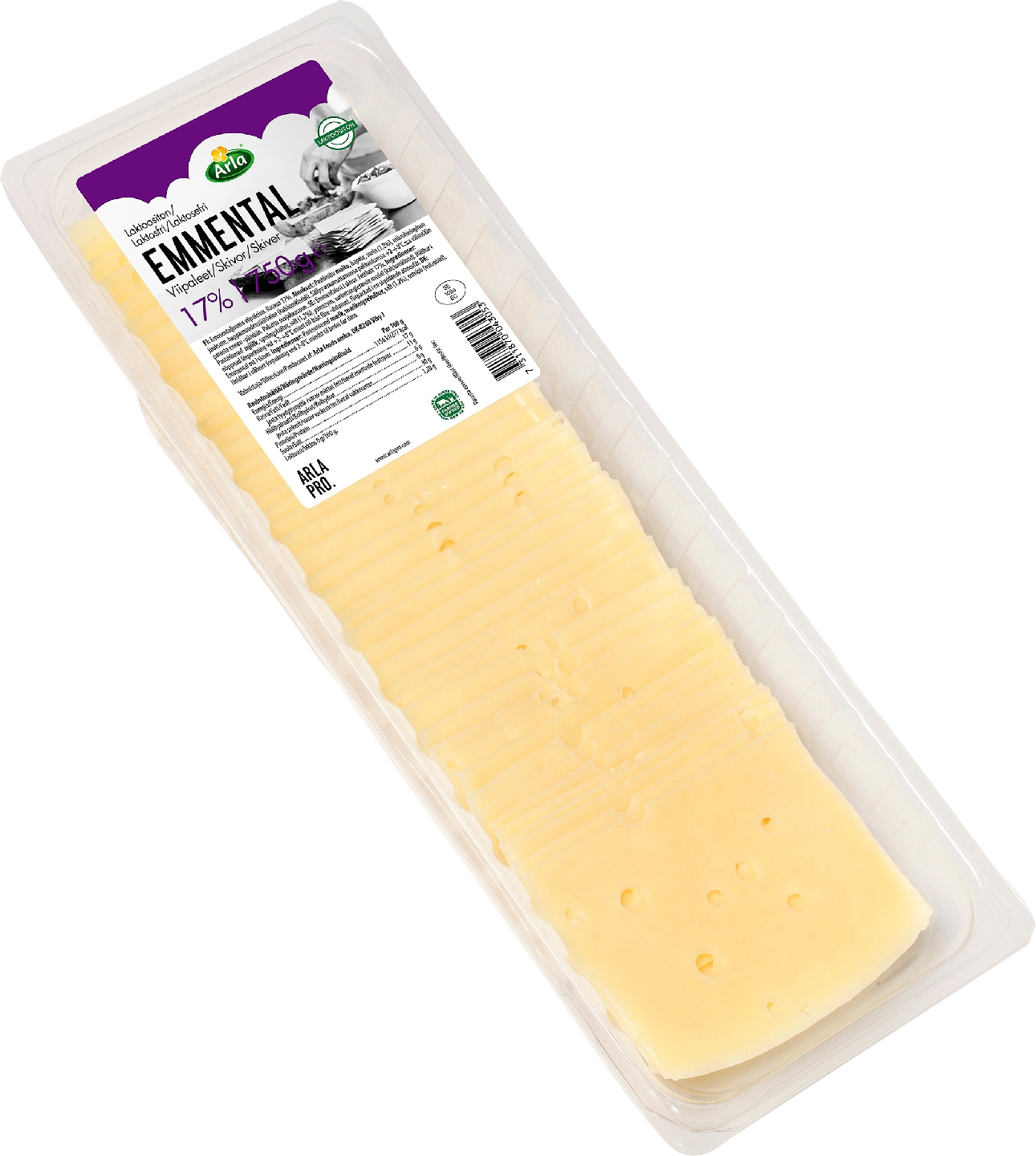 LaktoositonKevyt, emmentaltyyppinen juusto. Pakkauksessa 50 viipaletta (à 15g). Säilöntäaineeton. Laktoositon.