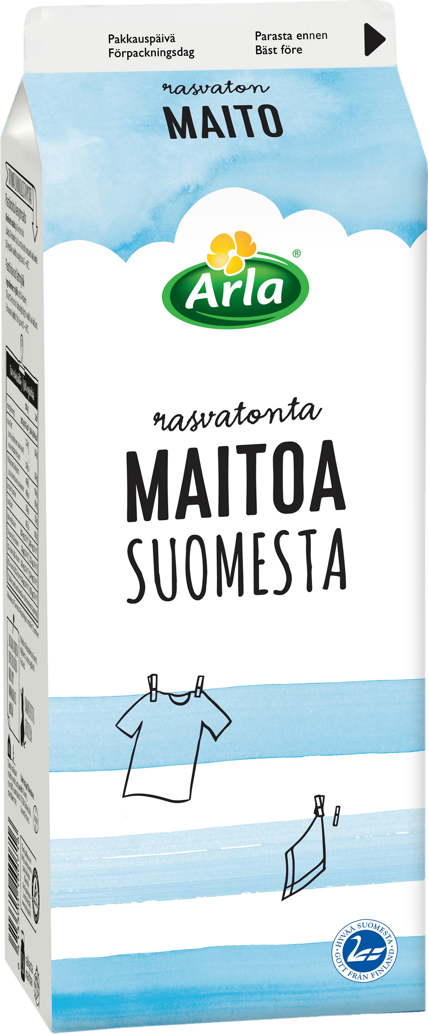 Arla Rasvatonta Maitoa Suomesta on valmistettu Suomessa suomalaisesta maidosta. Maito on monipuolinen ravintoaineiden lähde. Maito sisältää runsaasti proteiinia ja kalsiumia, jonka imeytymistä parannetaan lisäämällä maitoon D-vitamiinia. Raikas rasvaton maito maistuu koko perheelle niin ruokajuomana kuin janojuomanakin.