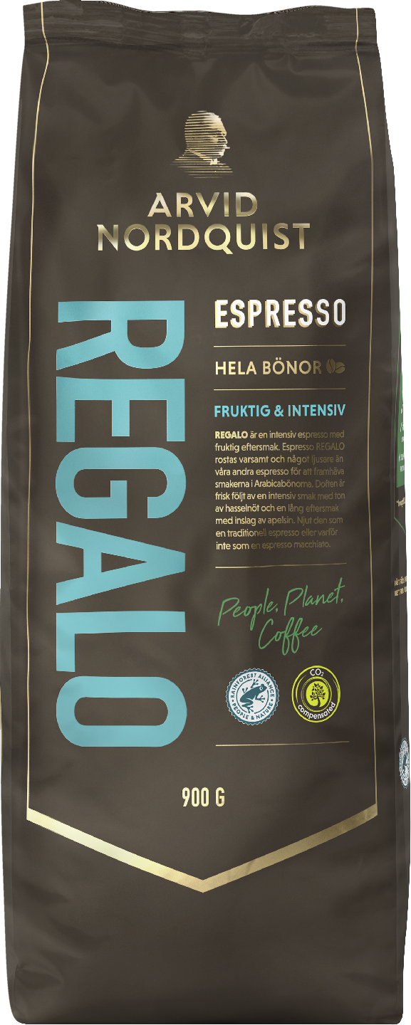 Regalo on intensiivinen espresso, jossa on hedelmäinen jälkimaku. Kahvi on vaaleampipaahtoisempaa kuin muut meidän espressomme ja näin Arabica-papujen hienot makuvivahteet saadaan parhaiten esiin. Tuoksu on raikas, maussa on hasselpähkinän vivahteita ja pitkässä jälkimaussa on häivähdys appelsiinia.