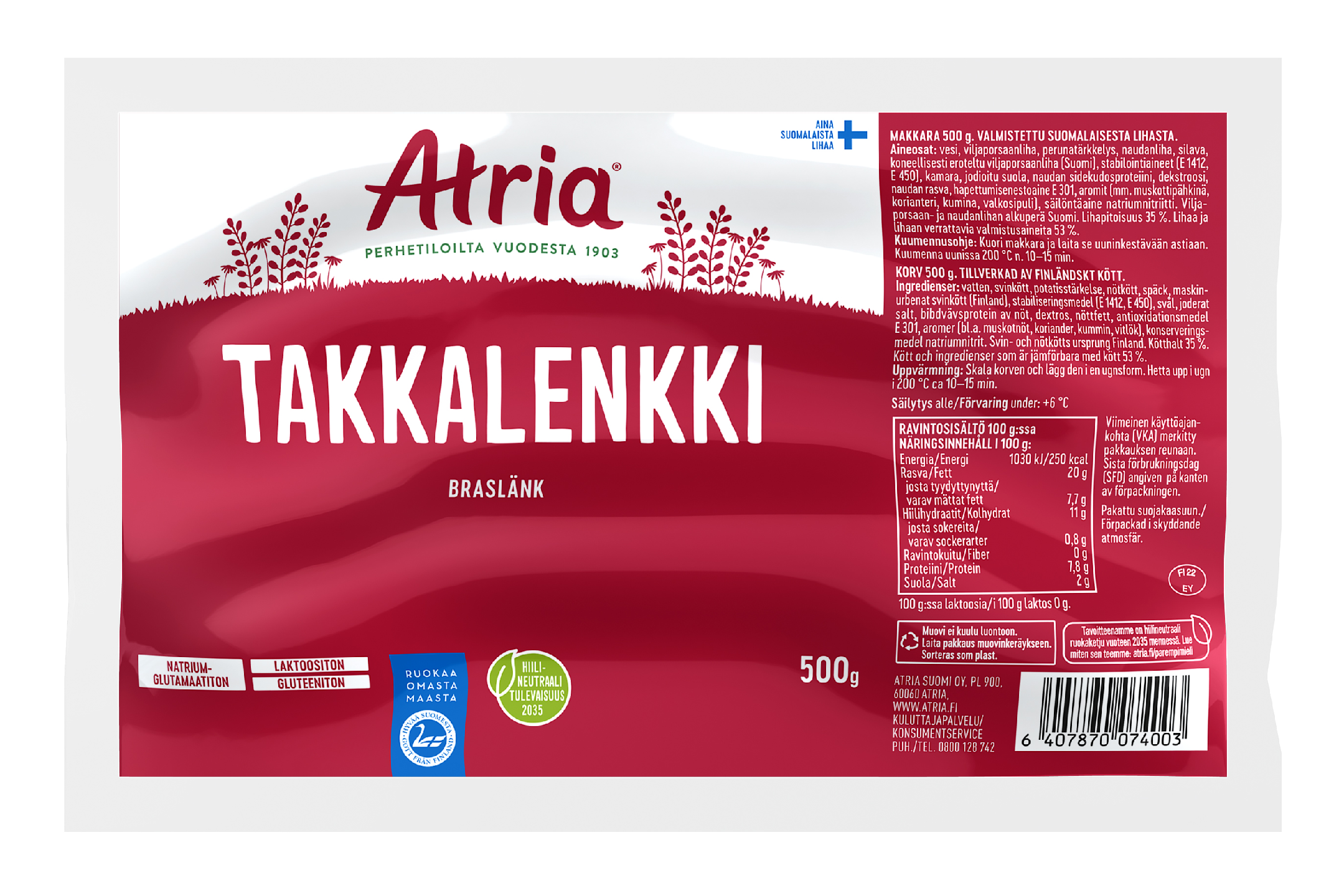 Atria Takkalenkki on maistuva, perinteinen lenkkimakkara vaikkapa takkatulen loimussa nautiskeluun. Kokeile Takkalenkkiä myös pizzassa! Laita uuni lämpenemään 225 asteeseen. Laita valmis pizzapohja leivinpaperin päälle pellille. Mausta tomaattipyree murskatulla valkosipulilla, pippurilla ja yrttimausteilla. Levitä seos pizzapohjan päälle. Kuori ja suikaloi 1/2 takkalenkkimakkarasta. Suikaloi paprika ja viipaloi tomaatit sekä herkkusienet. Levitä ainekset pizzapohjan päälle, tomaattiviipaleet päällimmäiseksi. Voit ripotella niille vähän yrttimausteita. Peitä pinta juustoraasteella. Paista uunissa noin 15 minuuttia ja herkku on valmis nautittavaksi.