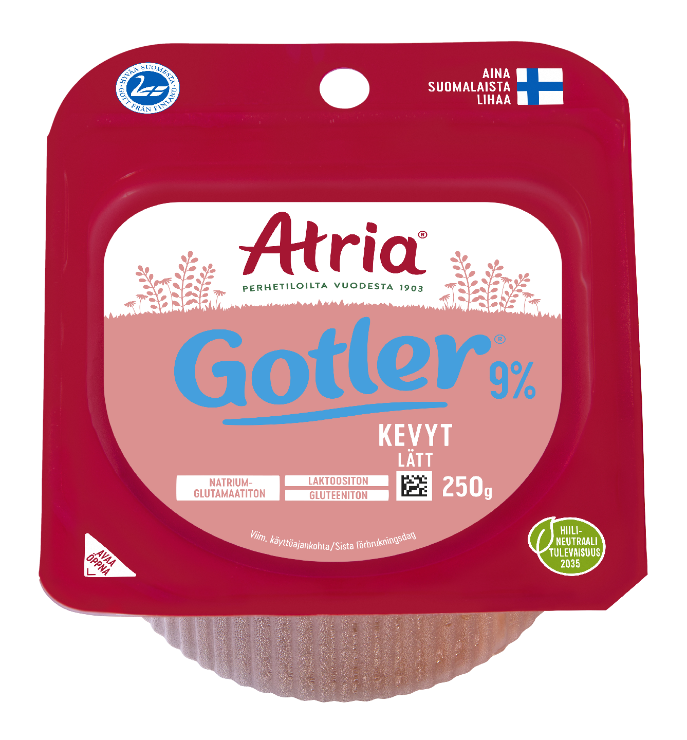 MaidotonSuomen suosituin leikkelemakkara kevyempänä versiona. Atria Kevyt Gotler on sianlihasta valmistettava lihaisa kinkkumakkara. Kinkunpalat tuovat viipaleeseen makua ja ulkonäköä.